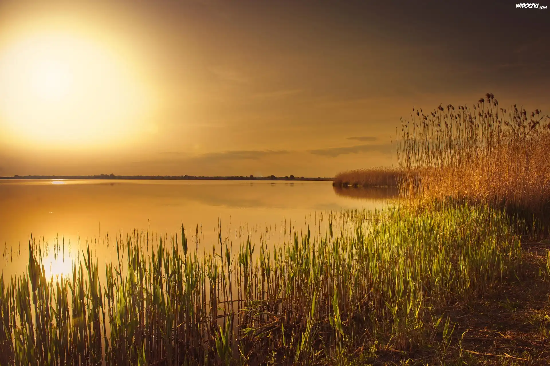 Zdjęcia, Jezioro, Zachód, Słońca, Trawa