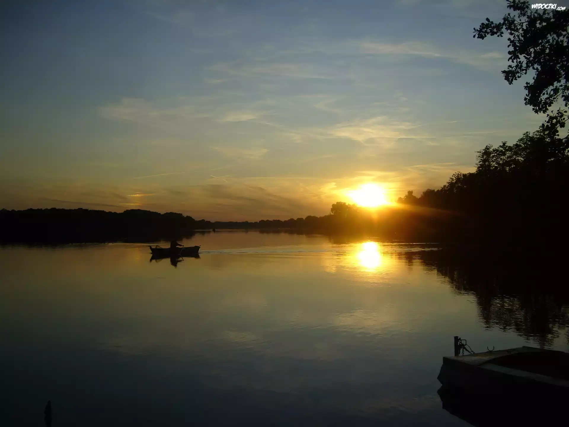 Zdjęcia, Jezioro, Zachód, Słońca, Wędkarz