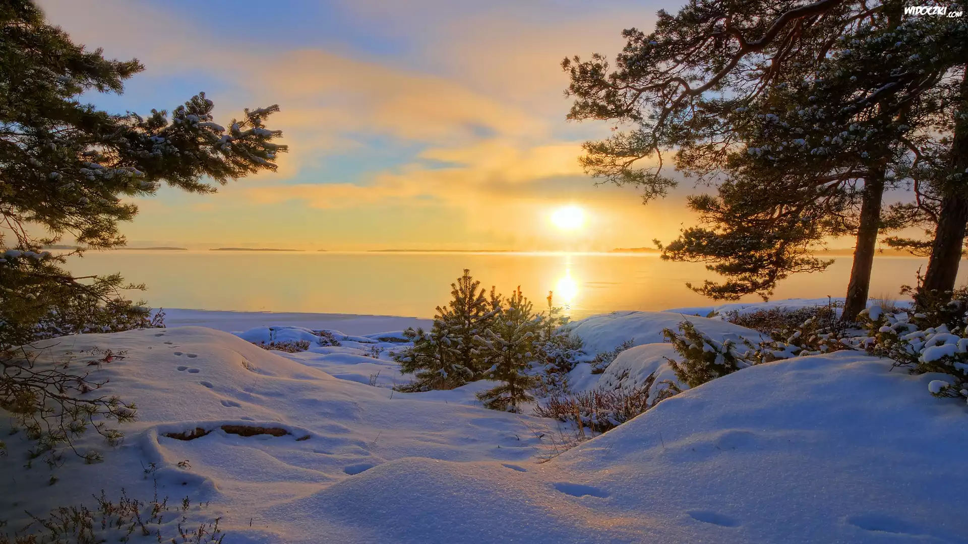 Zdjęcia, Jezioro, Zachód, Słońca, Zima