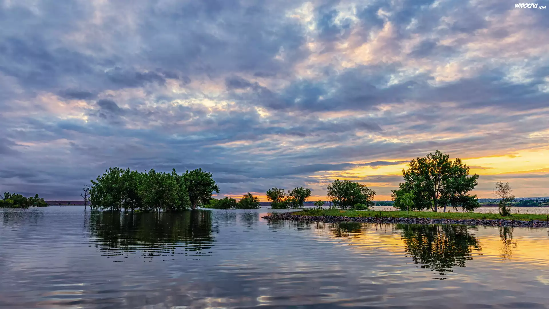 Stany Zjednoczone, Kolorado, Park stanowy, Chatfield State Park, Jezioro, Chatfield Lake, Drzewa, Chmury, Niebo |