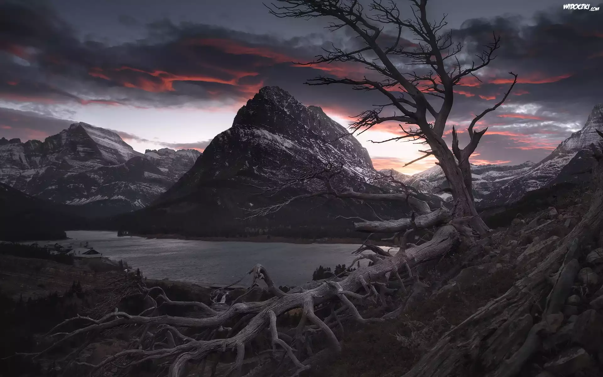 Jezioro, Swiftcurrent Lake, Góry, Park Narodowy Glacier, Bezlistne, Powalone, Drzewo, Zachód słońca, Montana, Stany Zjednoczone |