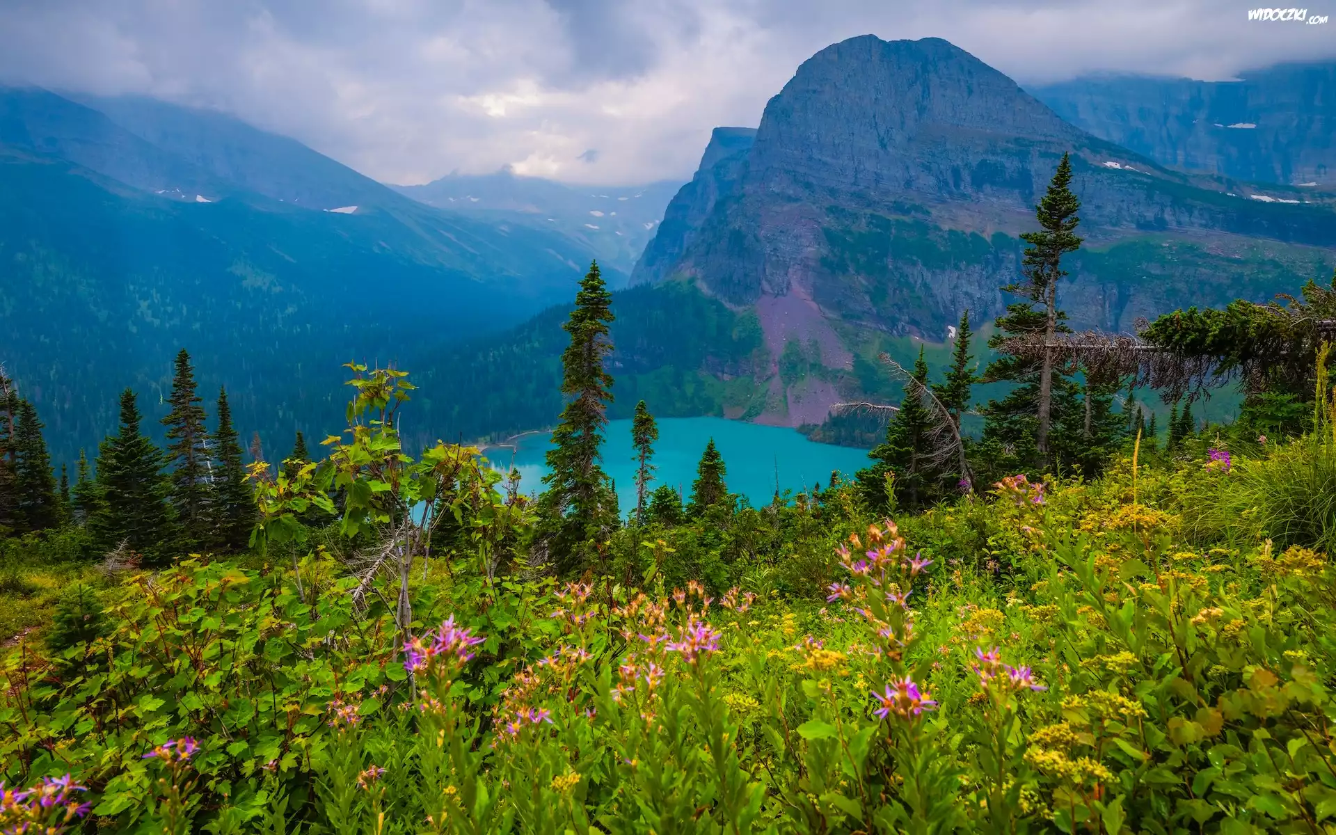 Park Narodowy Glacier, Montana, Stany Zjednoczone, Drzewa, Góry, Jezioro, Grinnell Lake, Łąka, Rośliny, Chmury |