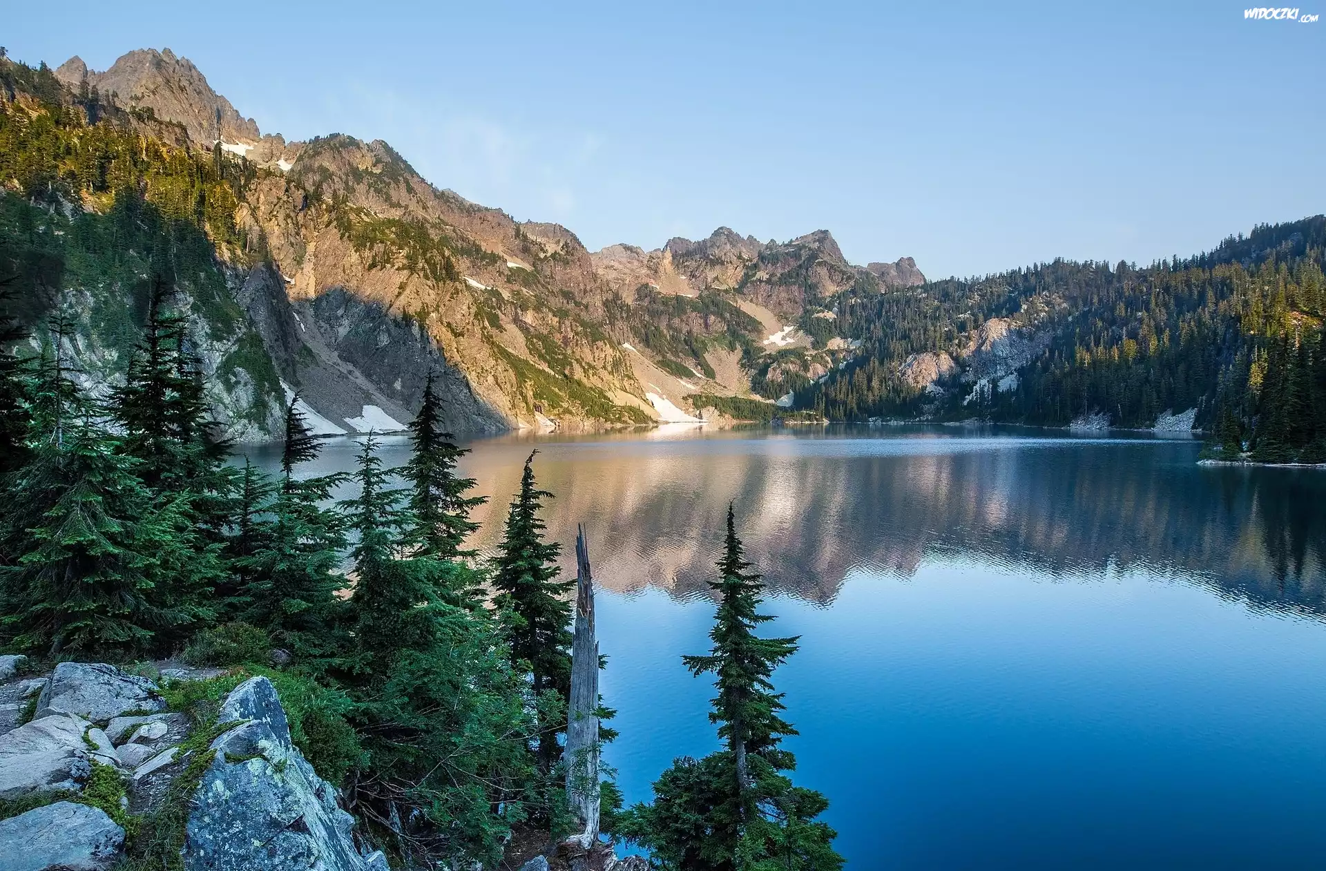 Jezioro Snow Lake, Góry Kaskadowe, Przełęcz Snoqualmie Pass, Świerki, Kamienie, Hrabstwo King, Stan Waszyngton, Stany Zjednoczone |
