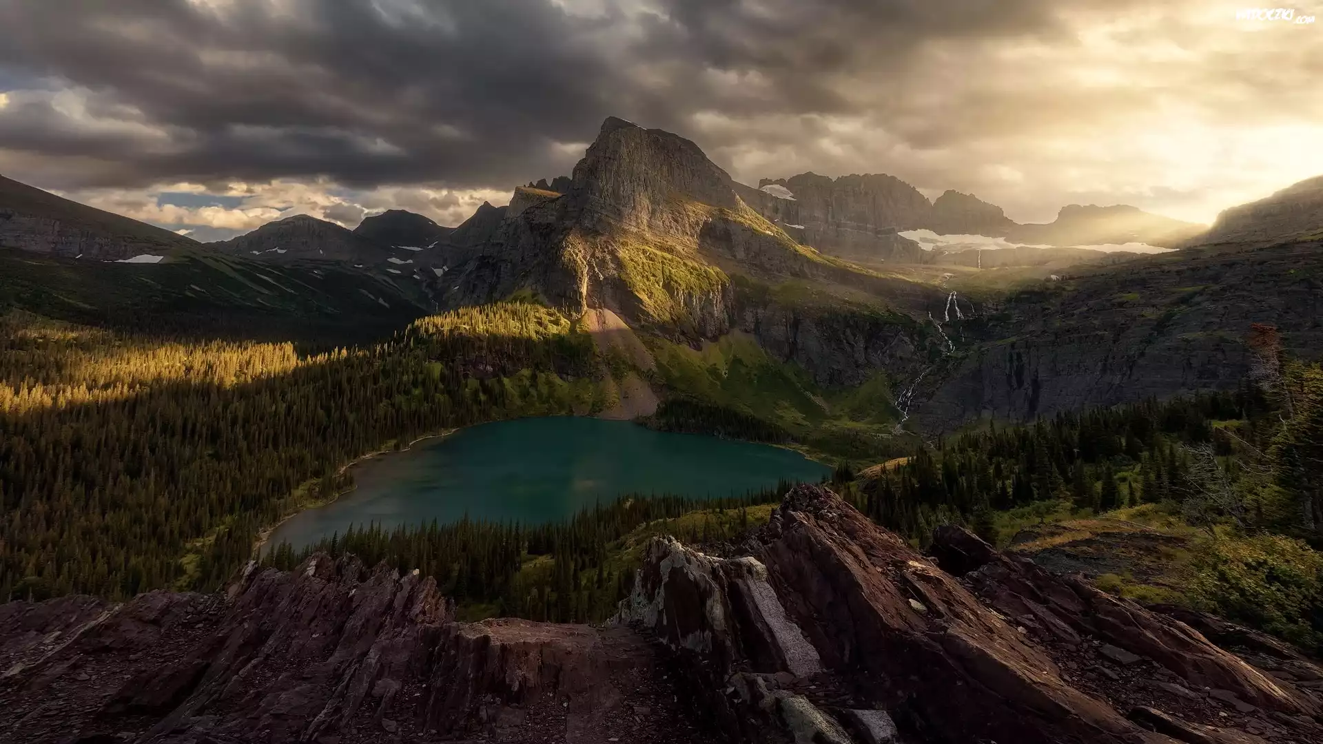 Jezioro, Grinnell Lake, Park Narodowy Glacier, Góry, Lewis Range, Drzewa, Skały, Chmury, Montana, Stany Zjednoczone |