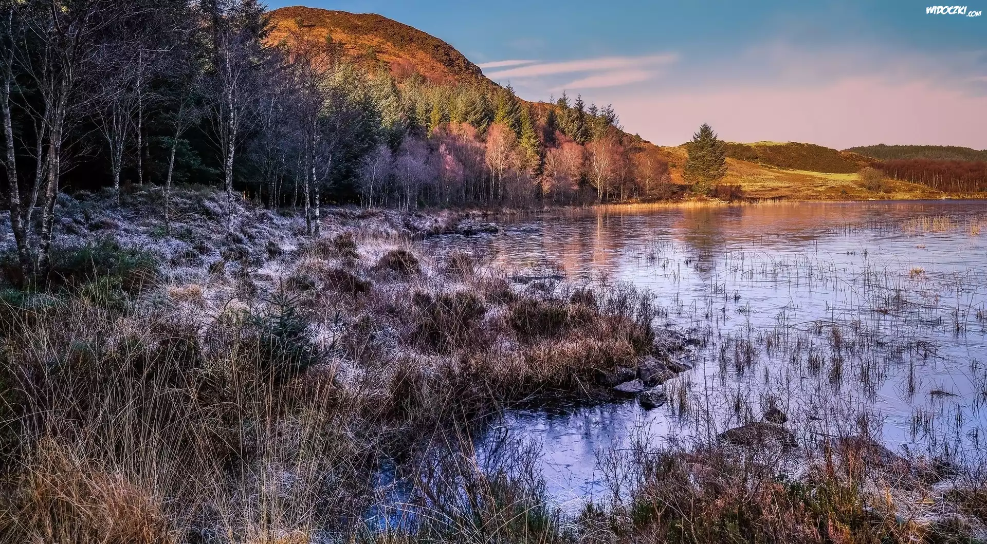 Zdjęcia, Jezioro, Jesień, Drzewa, Brzozy, Suche, Trawy