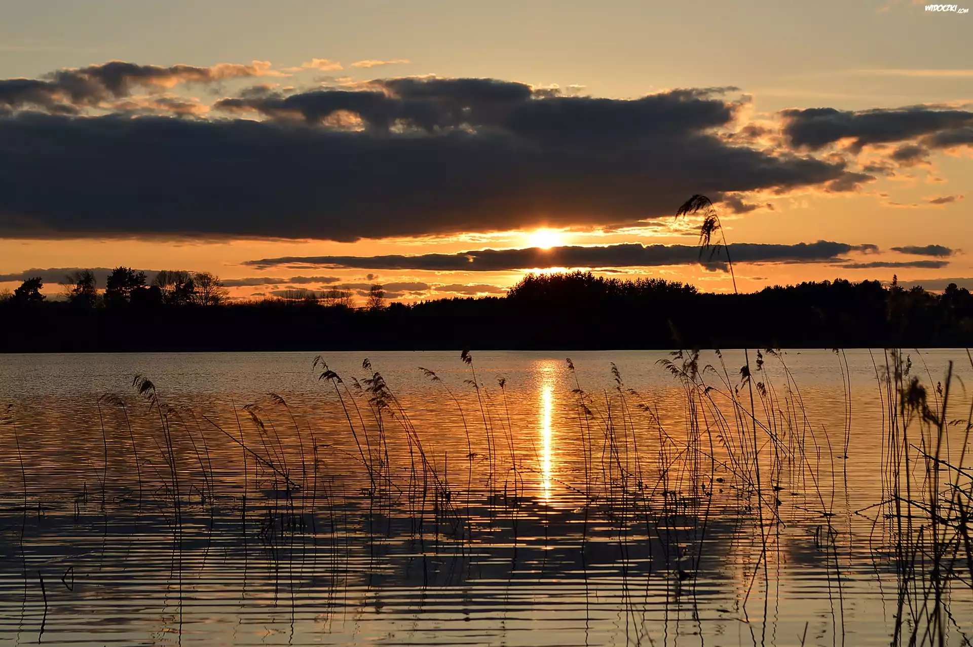 Jezioro, Zachód, Słońca, Chmury, Suche, Trawy