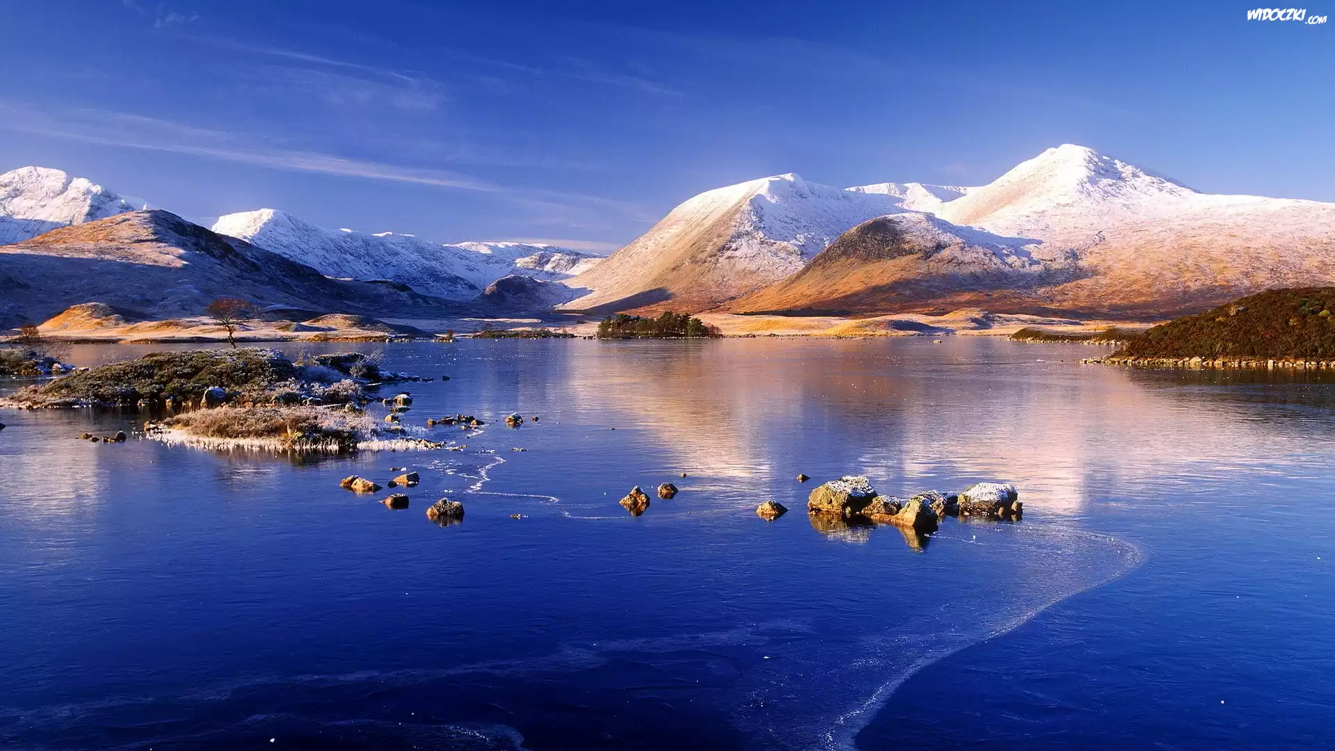 Zdjęcia, Jezioro, Wysepki, Góry, Ośnieżone, Szczyty, Zima