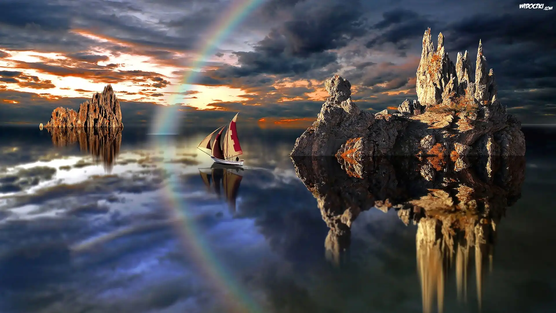 Jezioro, Skały, Tęcza, Żaglówka
