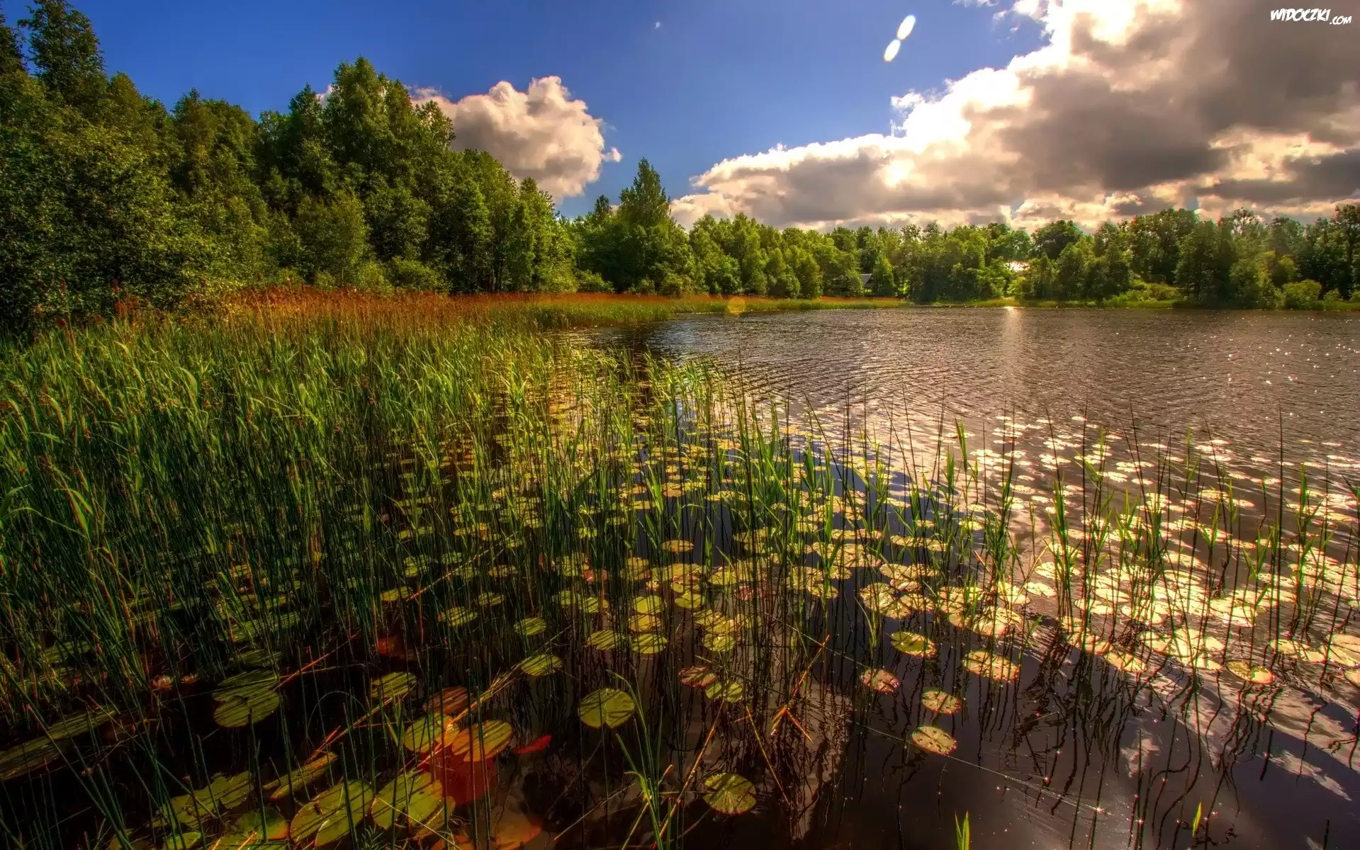 Zdjęcia, Jezioro, Drzewa, Trawy, Chmury