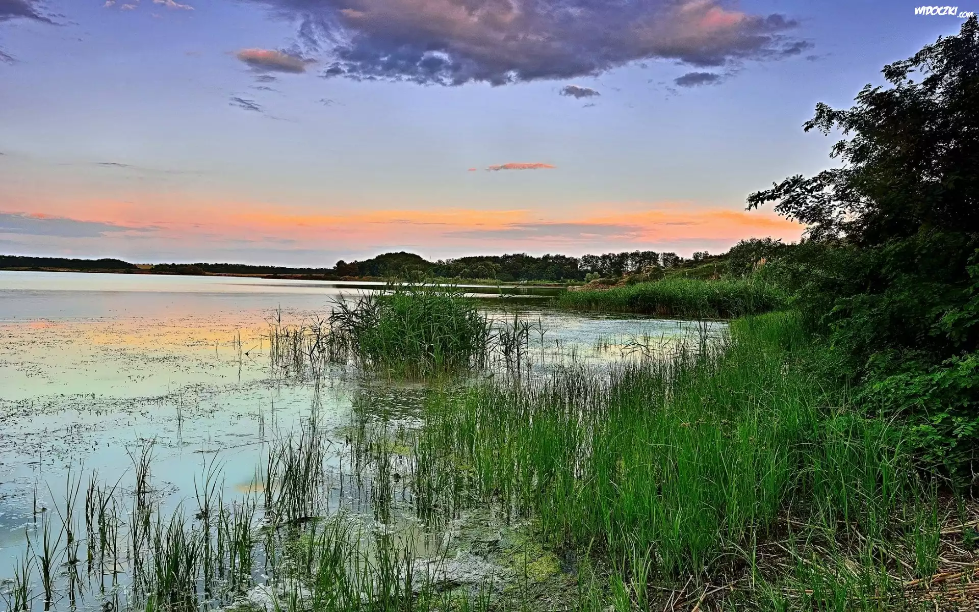 Zdjęcia, Jezioro, Lasy, Trawy, Chmury