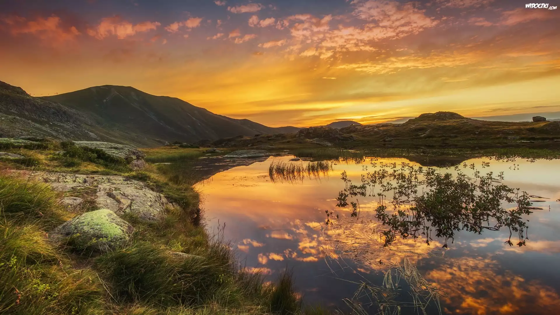 Jezioro, Góry, Skały, Trawy, Odbicie