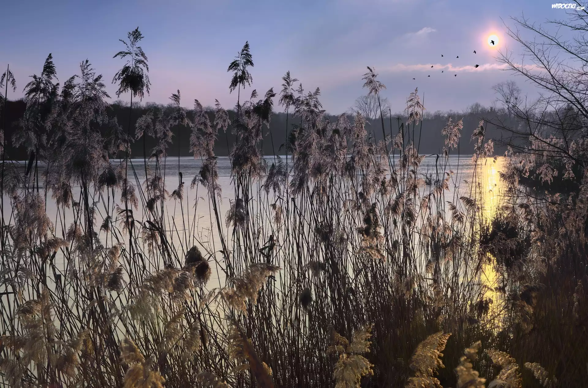 Jezioro, Trzciny, Wschód słońca, Trawy, Ptaki