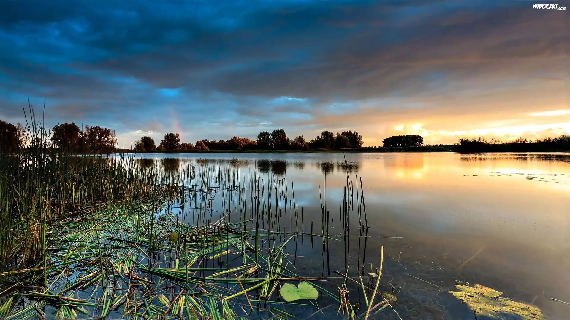 Zdjęcia, Jezioro, Zachód Słońca, Trzcina, Drzewa