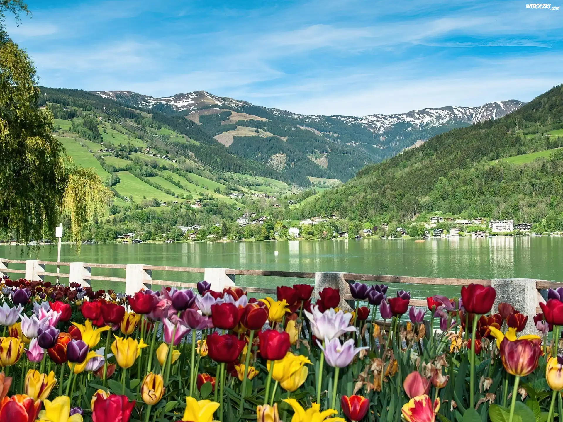 Zdjęcia, Tulipany, Jezioro, Góry