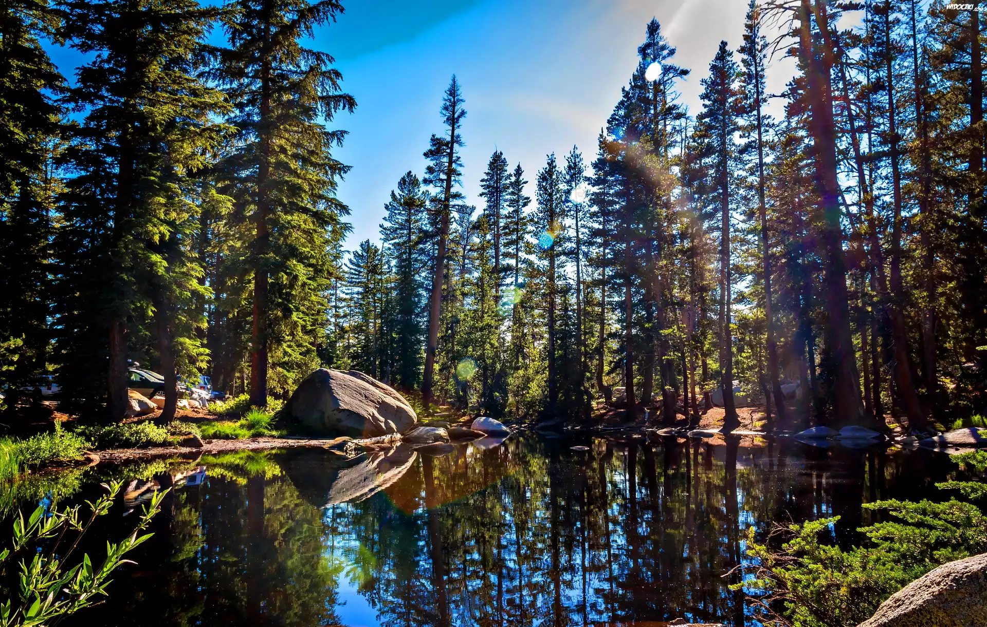 Zdjęcia, Stany Zjednoczone, Stan Kalifornia, Park Narodowy Yosemite, Góry, Lasy, Jezioro, Kamienie
