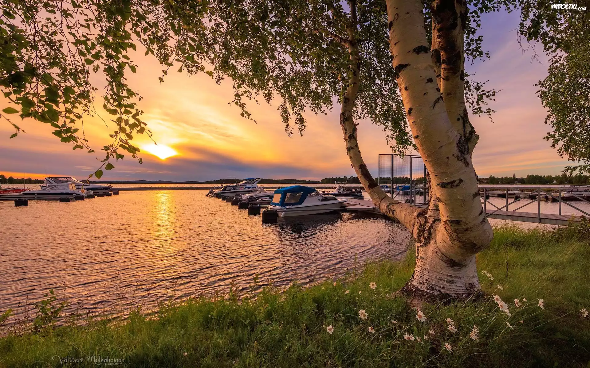 Jezioro, Zachód słońca, Drzewa, Brzoza, Motorówki, Przystań, Sotkamo, Vuokatti, Finlandia