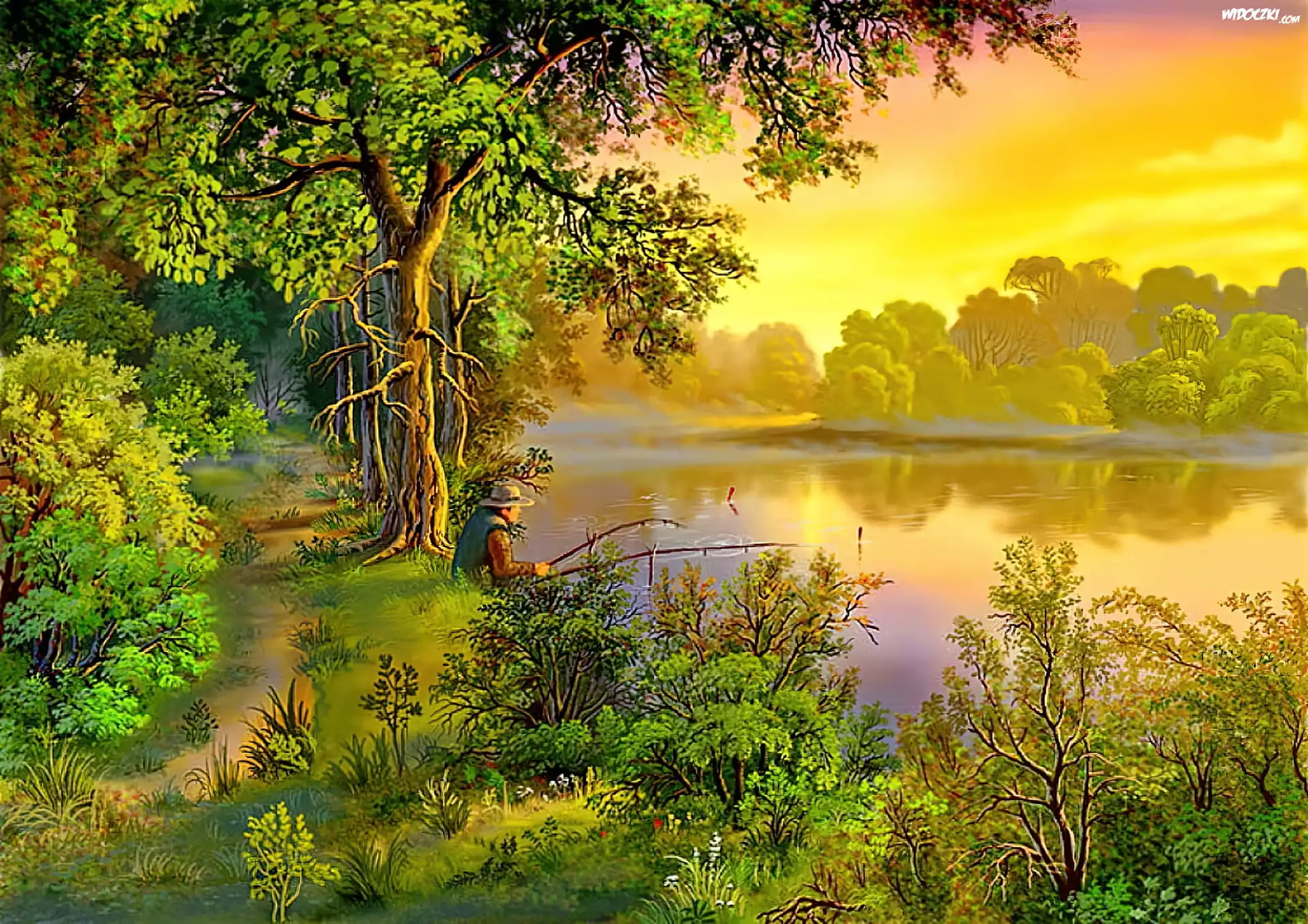 Zdjęcia, Jezioro, Dróżka, Wędkarz, Lato