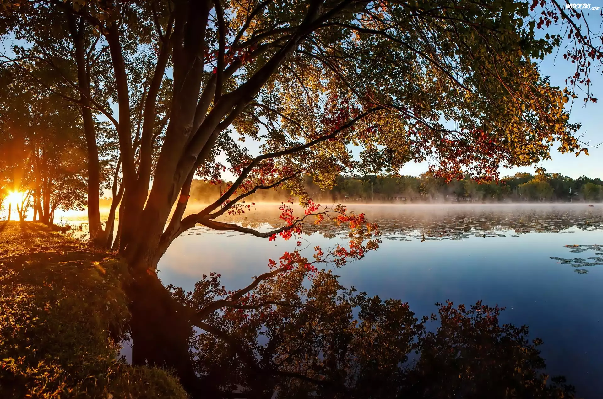 Zdjęcia, Jezioro, Las, Mgła, Przebijające, Światło, Drzewa