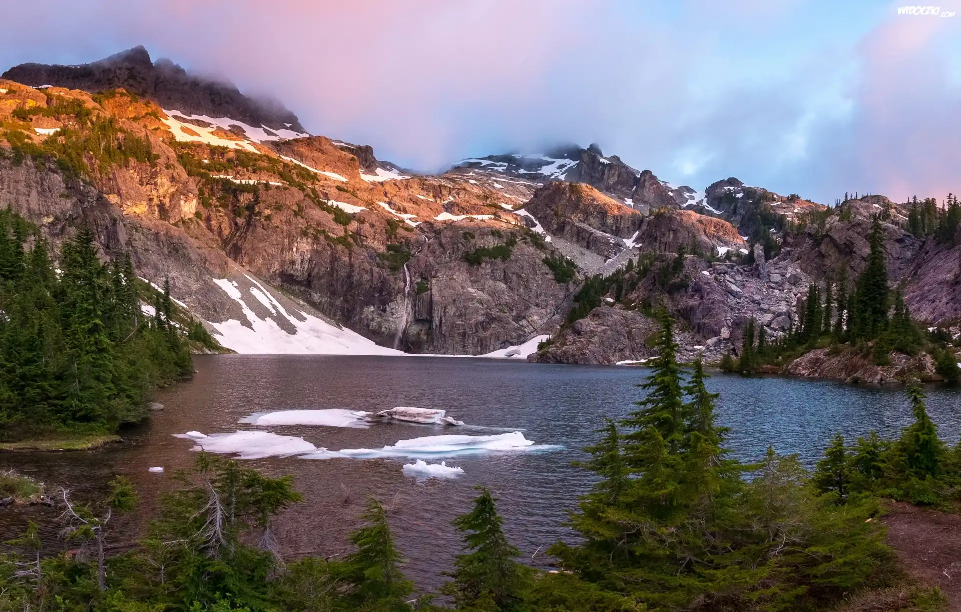 Zdjęcia, Jezioro, Góry, Świerki, Śnieg