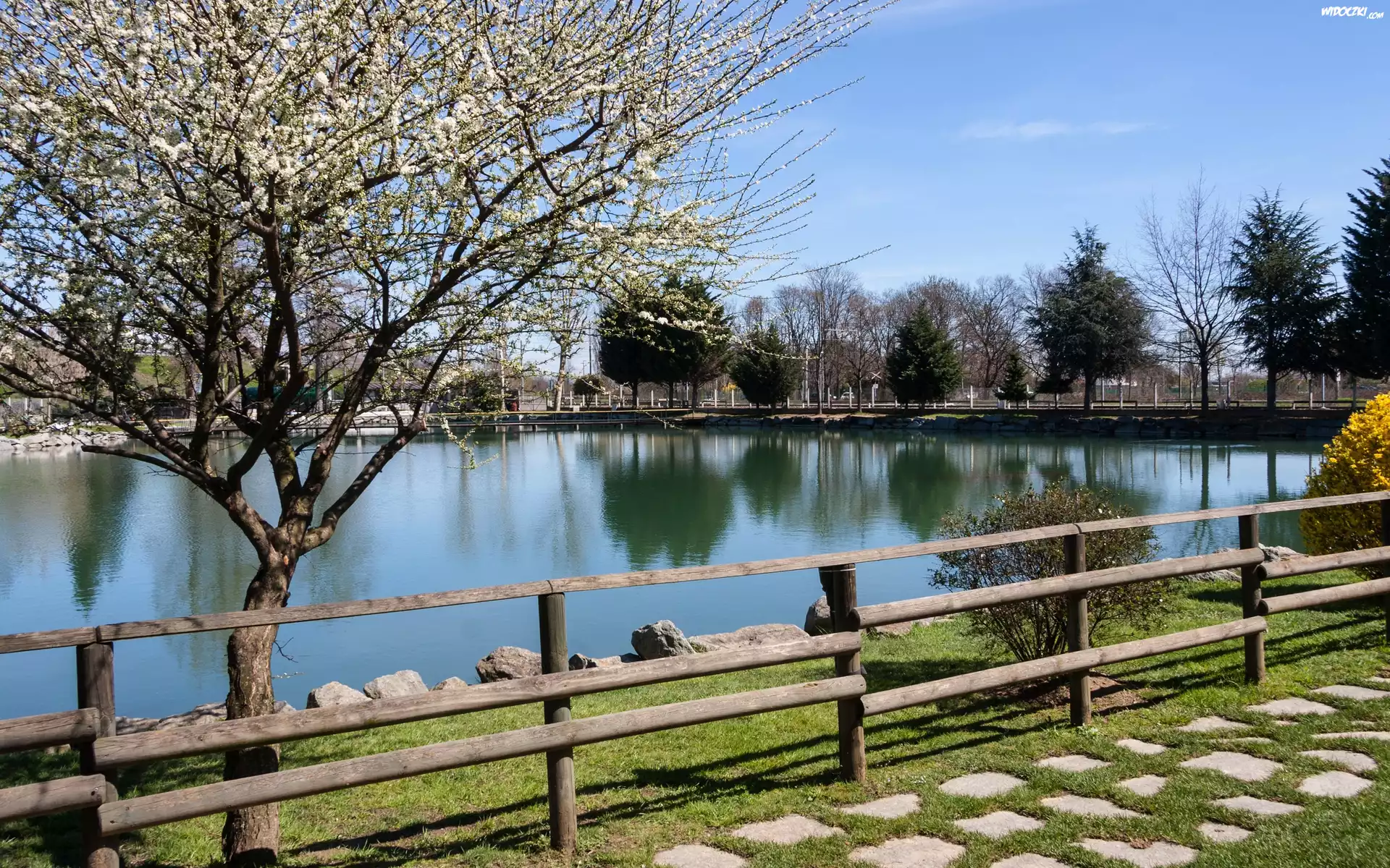 Zdjęcia, Wiosna, Jezioro, Kwitnące, Drzewo, Krzewy, Ogrodzenie, Odbicie