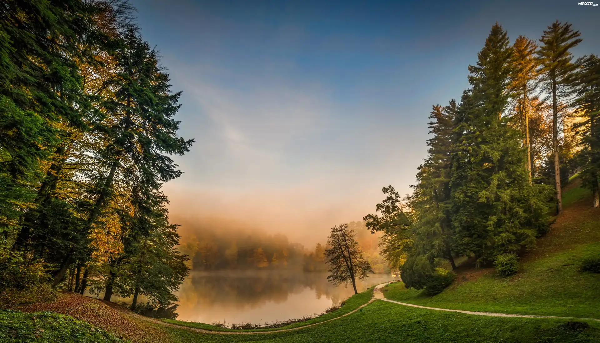 Zdjęcia, Jezioro, Las, Mgła, Świt, Chorwacja