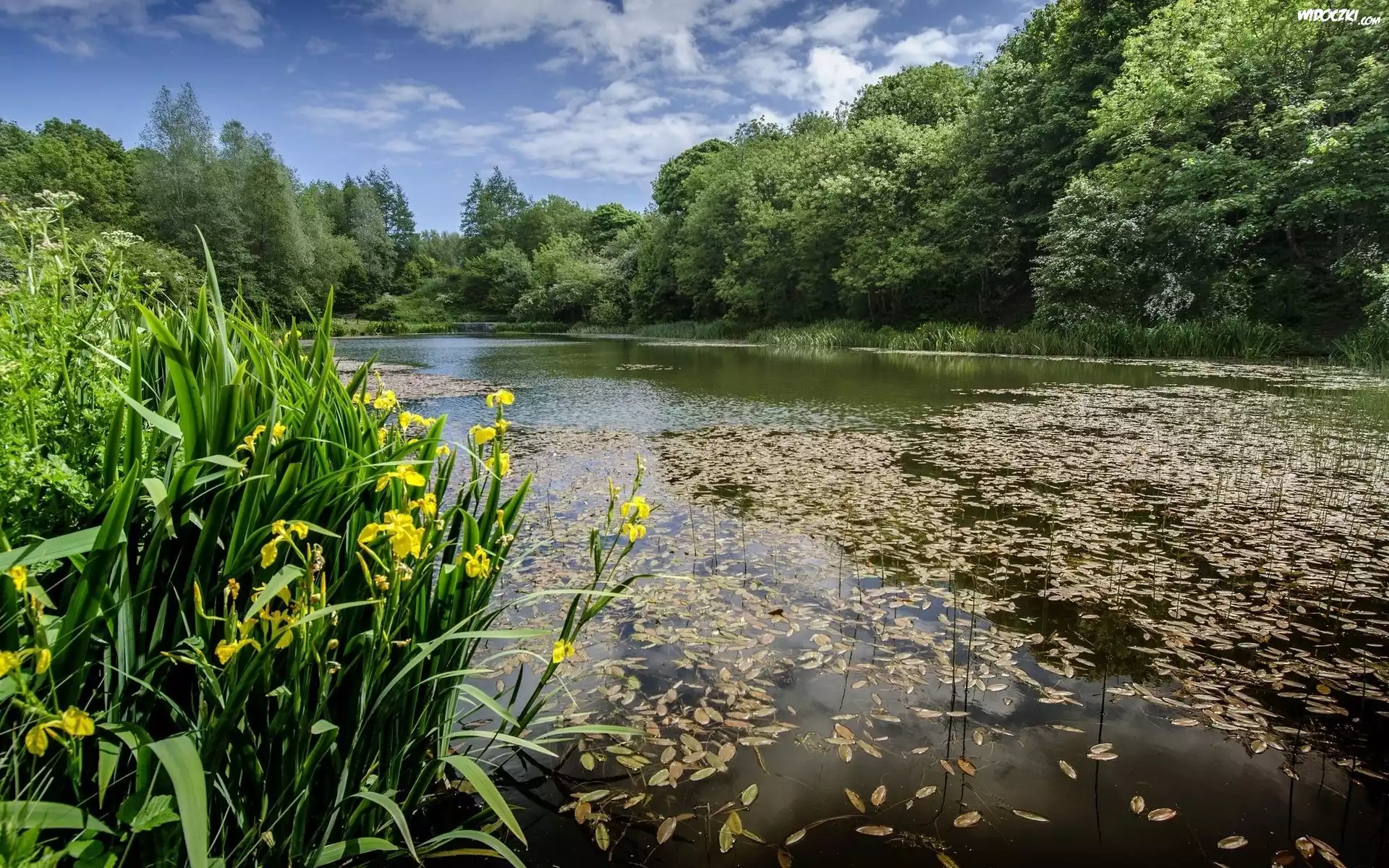 Lato, Jezioro, Opadłe, Liście, Drzewa, Kwiaty, Irysy wodne