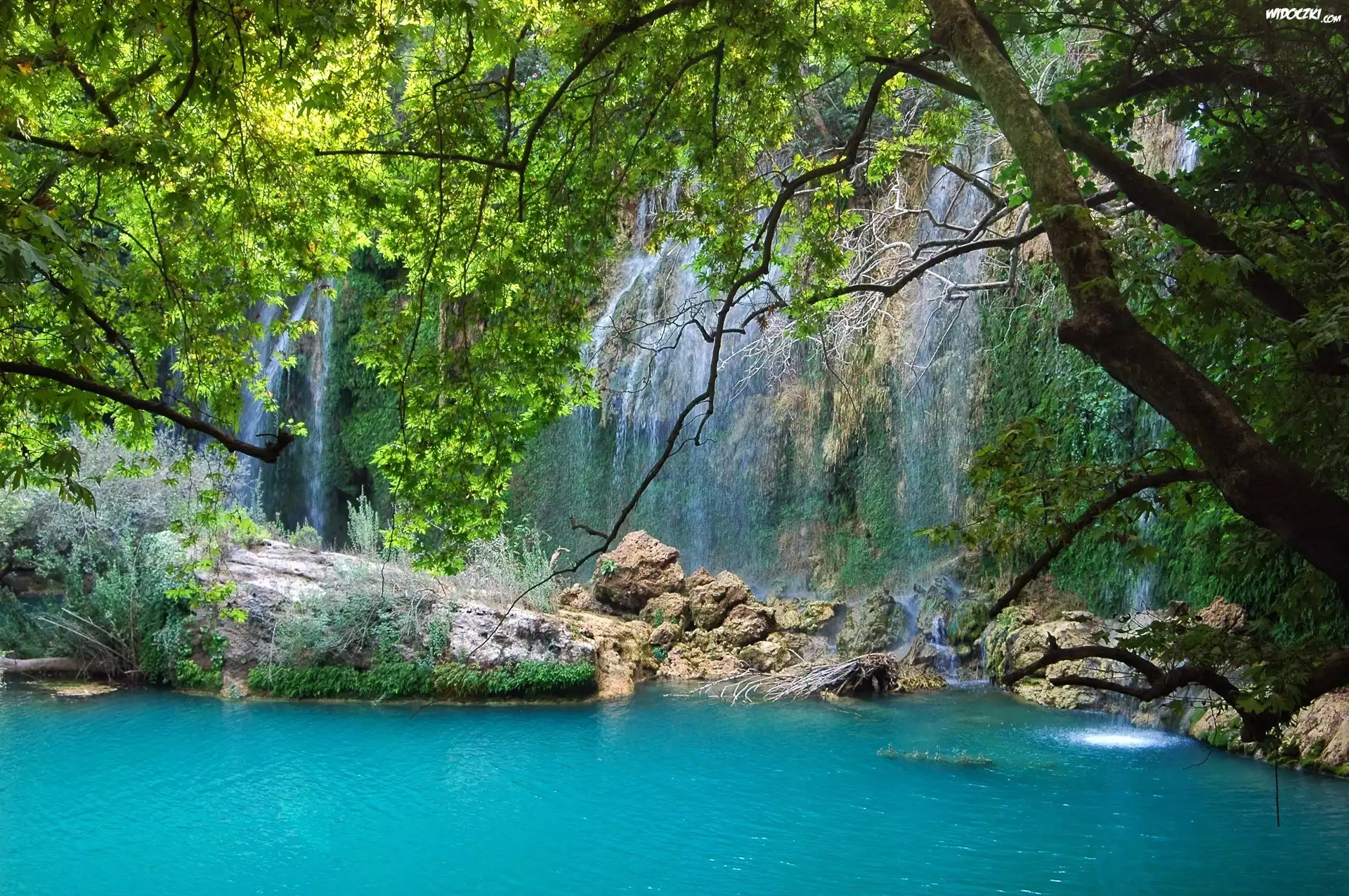 Zdj臋cia, Wodospad, Jezioro, Drzewa