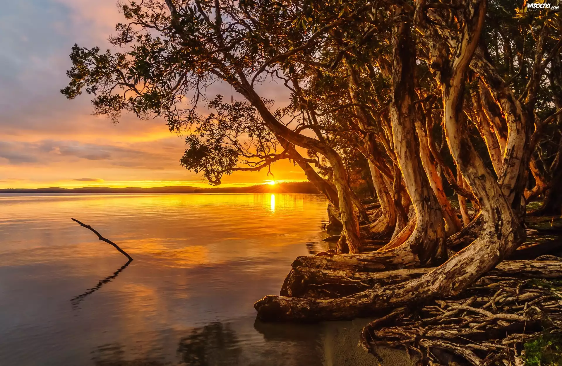 Jezioro, Krzywe, Drzewa, Wschód słońca