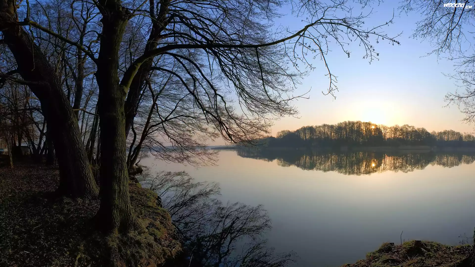 Zdjęcia, Jezioro, Drzewa, Wschód słońca
