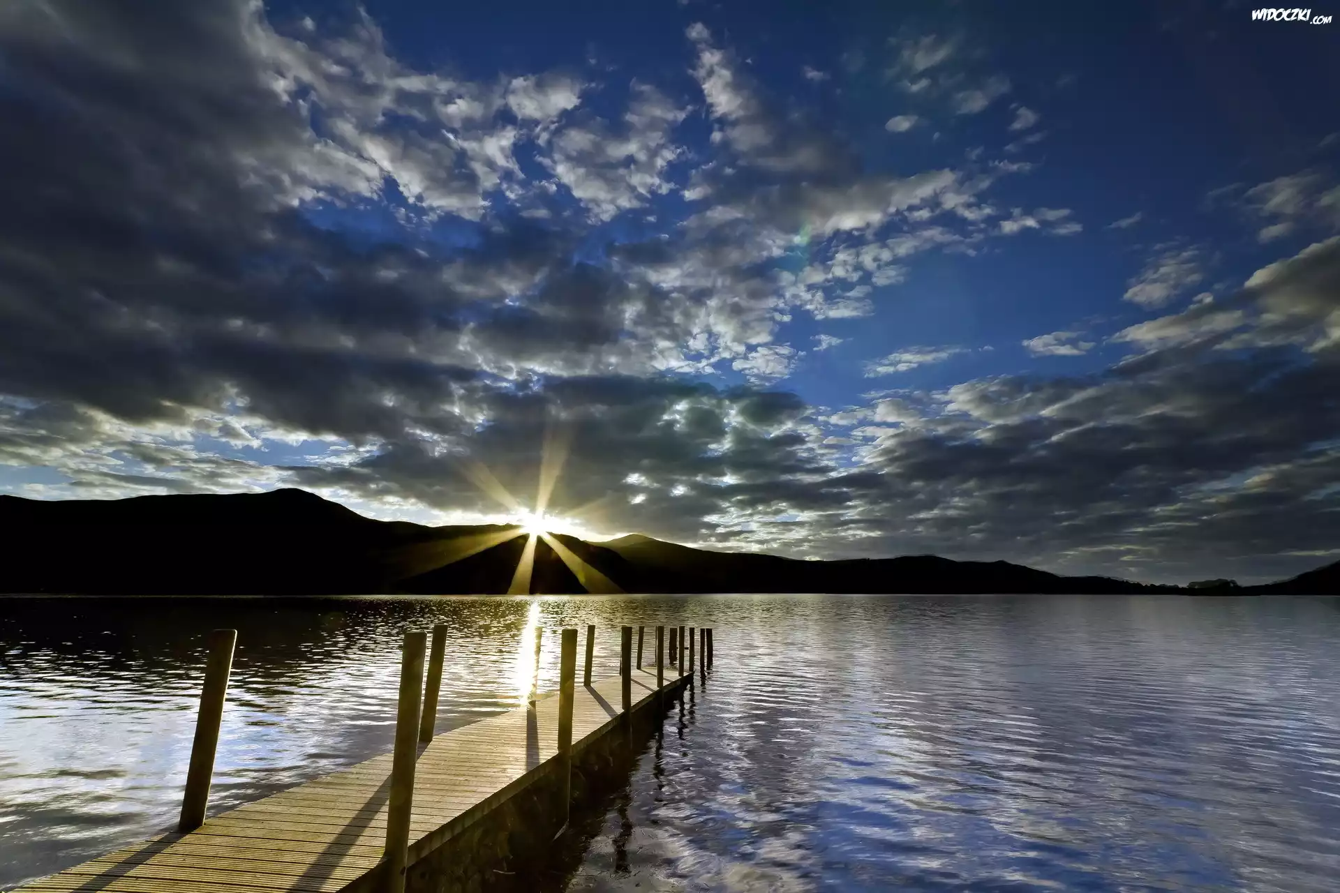 Jezioro, Pomost, Góry, Chmury, Wschód, Słońca