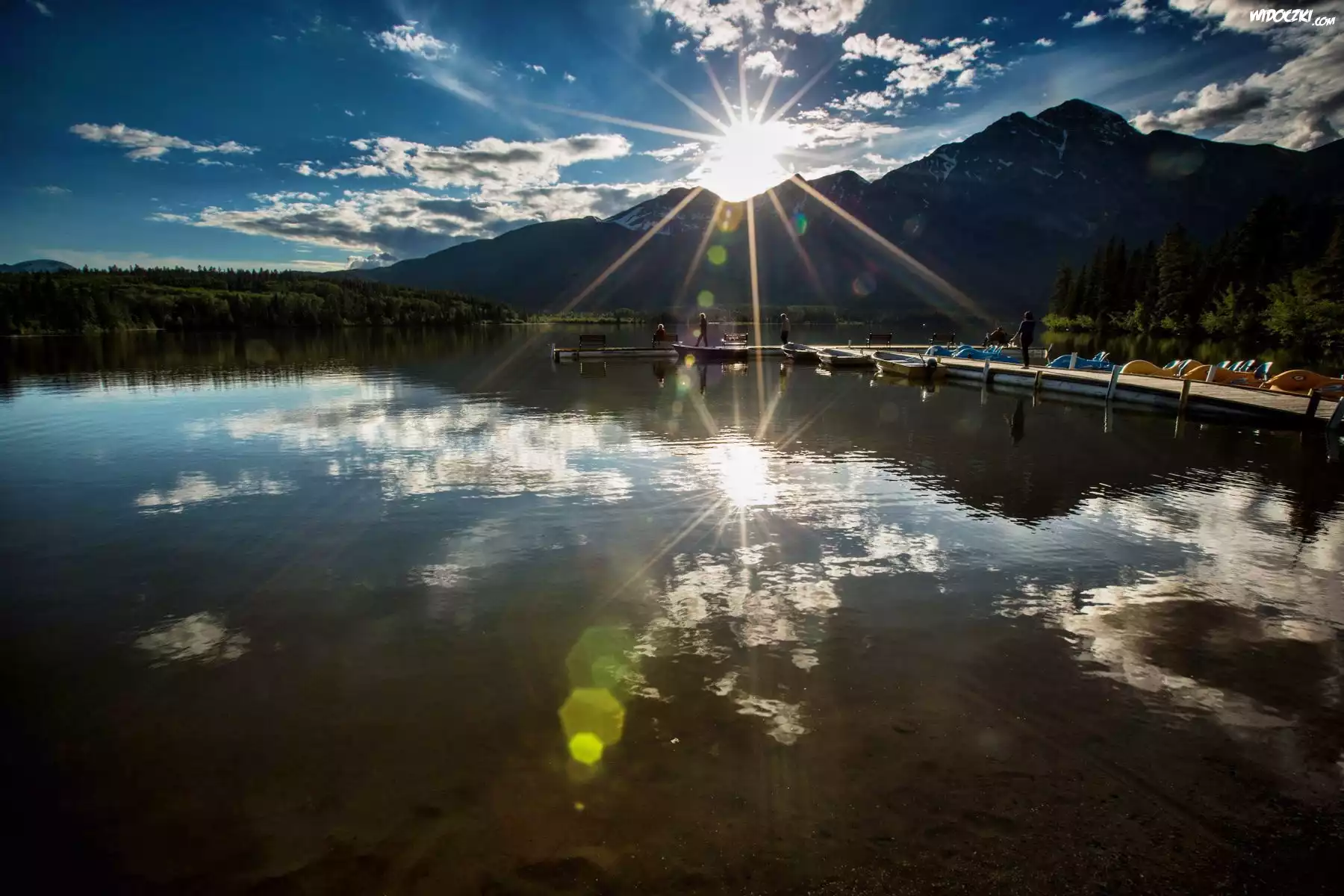Zdjęcia, Jezioro, Pomost, Góry, Wschód, Słońca