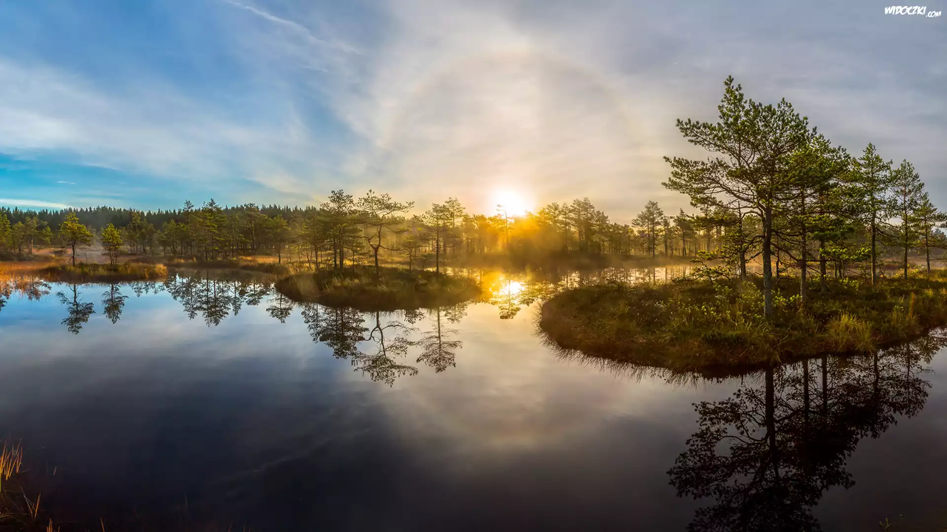 Jezioro, Wysepki, Las, Drzewa, Wschód słońca