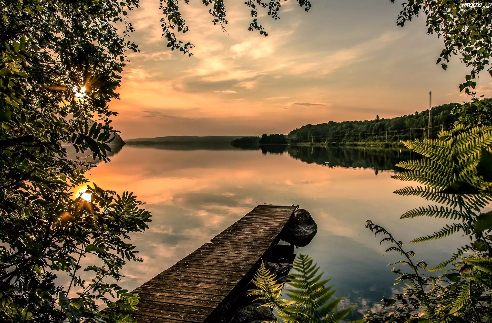 Jezioro, Drzewa, Roślinność, Pomost, Wschód, Słońca