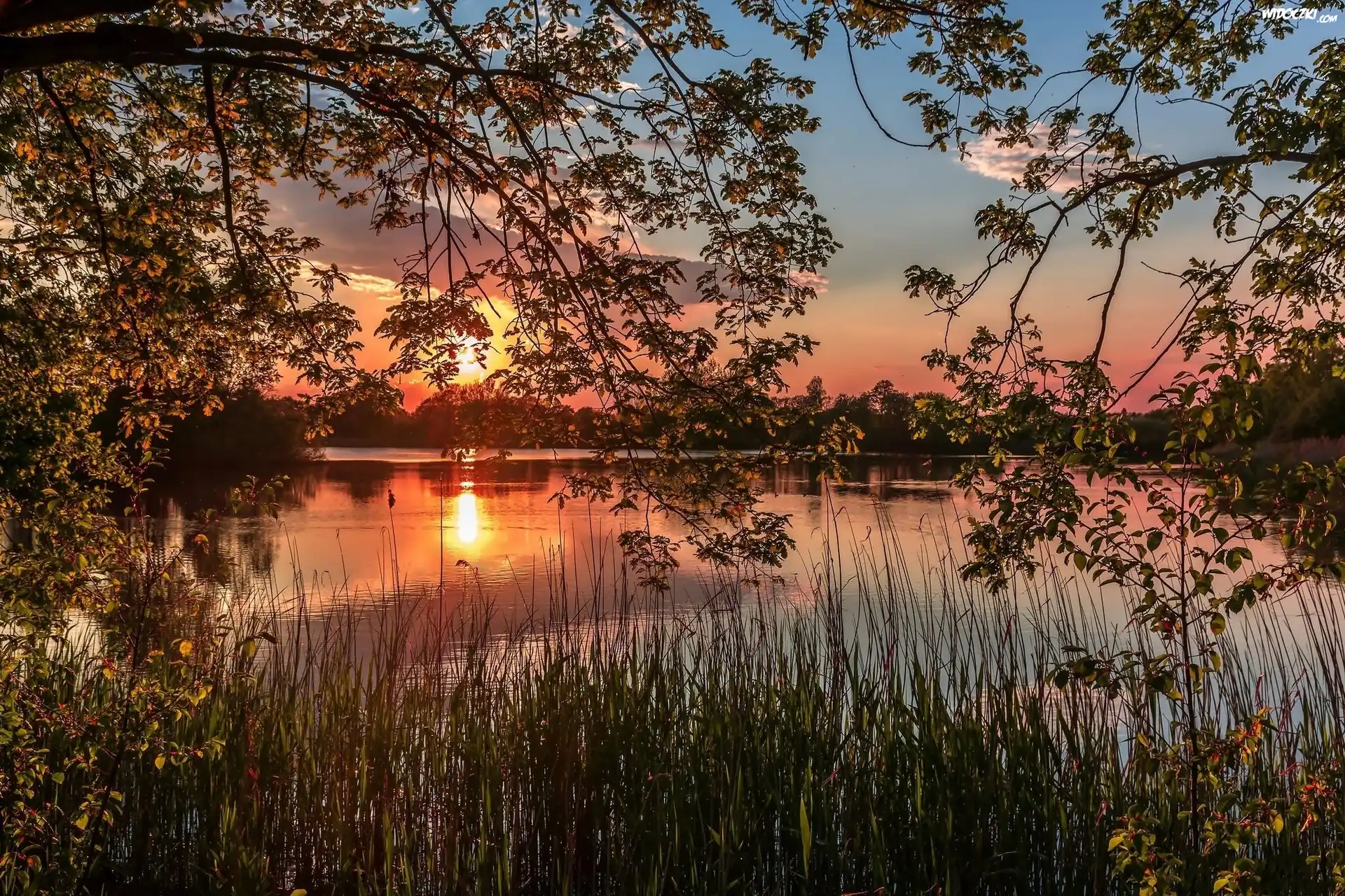 Jezioro, Drzewa, Trawy, Wschód, Słońca