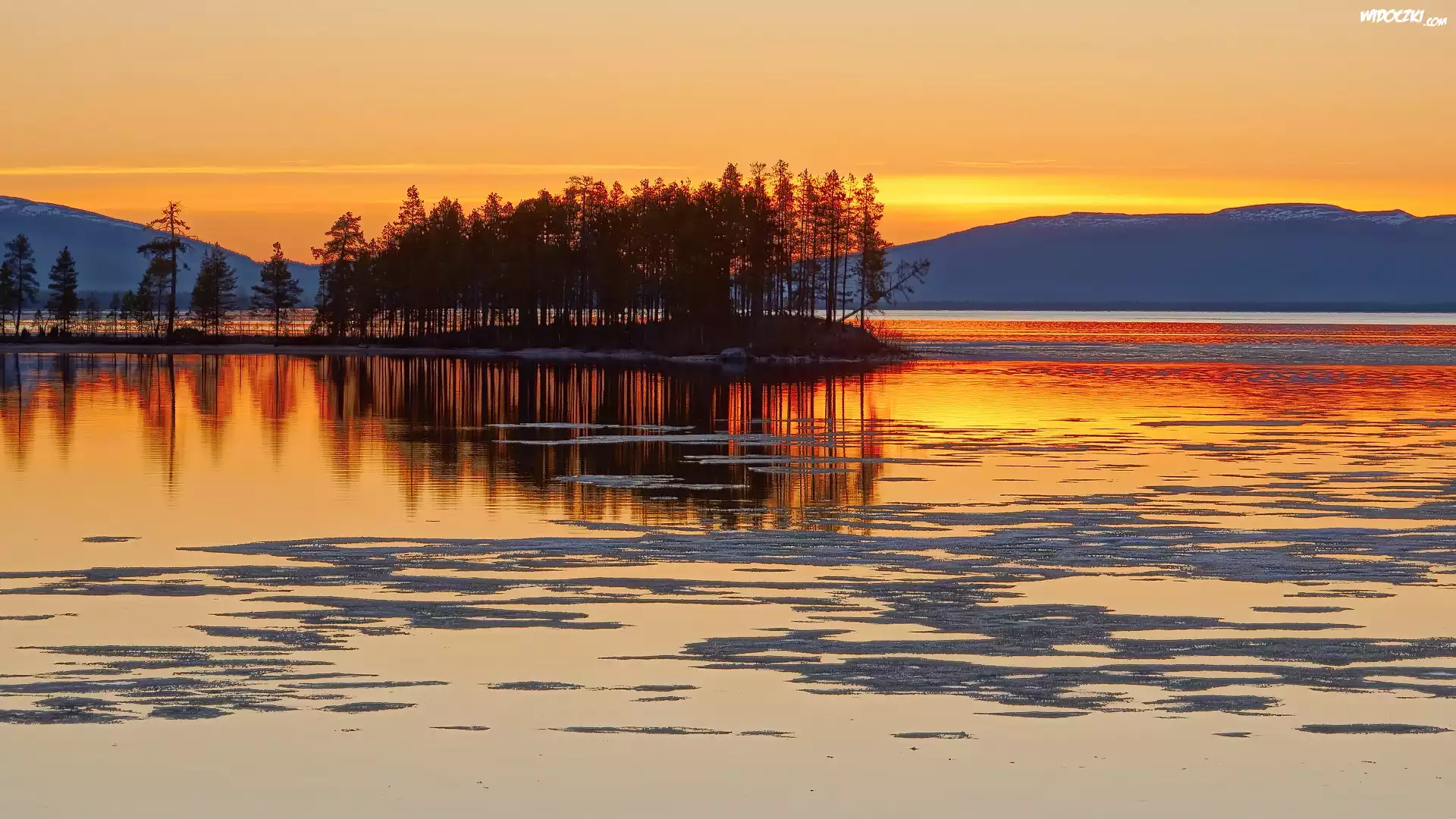 Zdjęcia, Jezioro, Góry, Wysepka, Drzewa, Wschód, Słońca