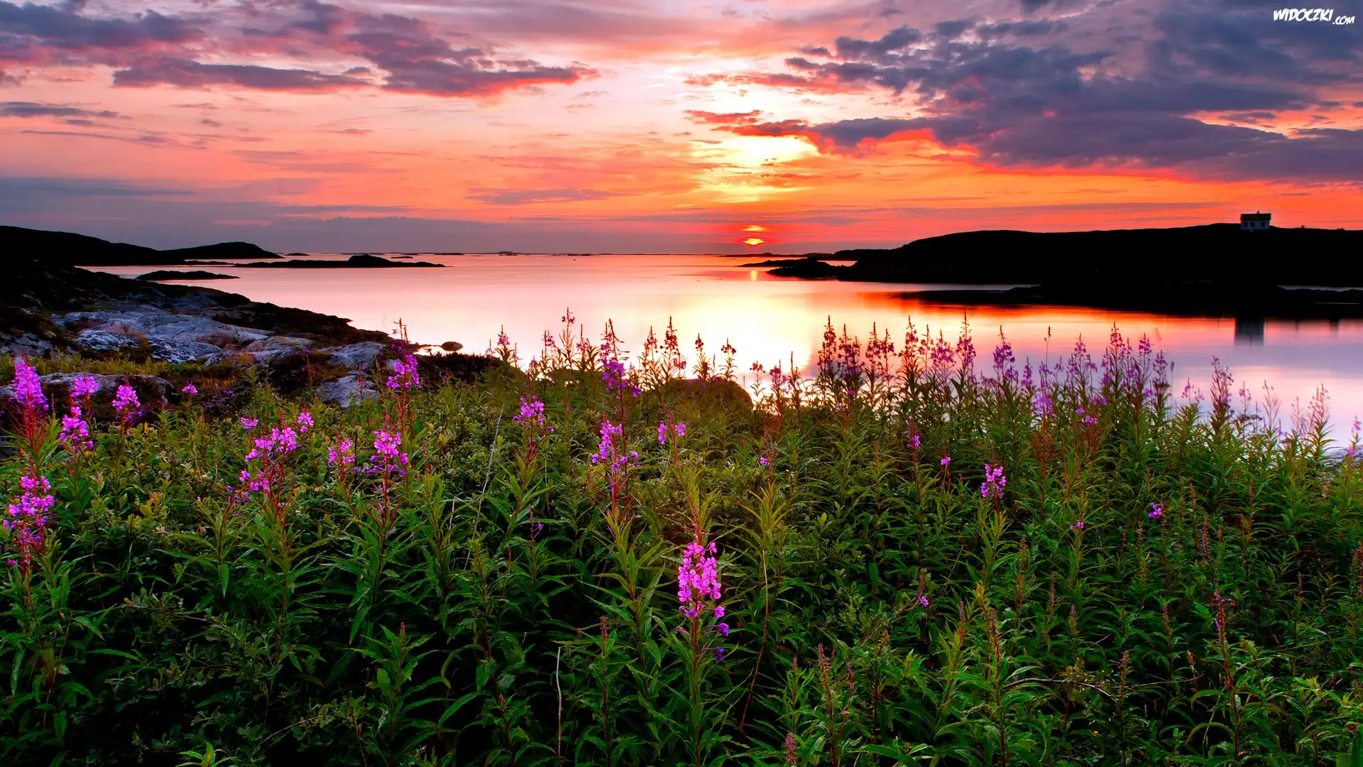 Zdjęcia, Jezioro, Zachód, Słońca, Wybrzeże, Kwiaty