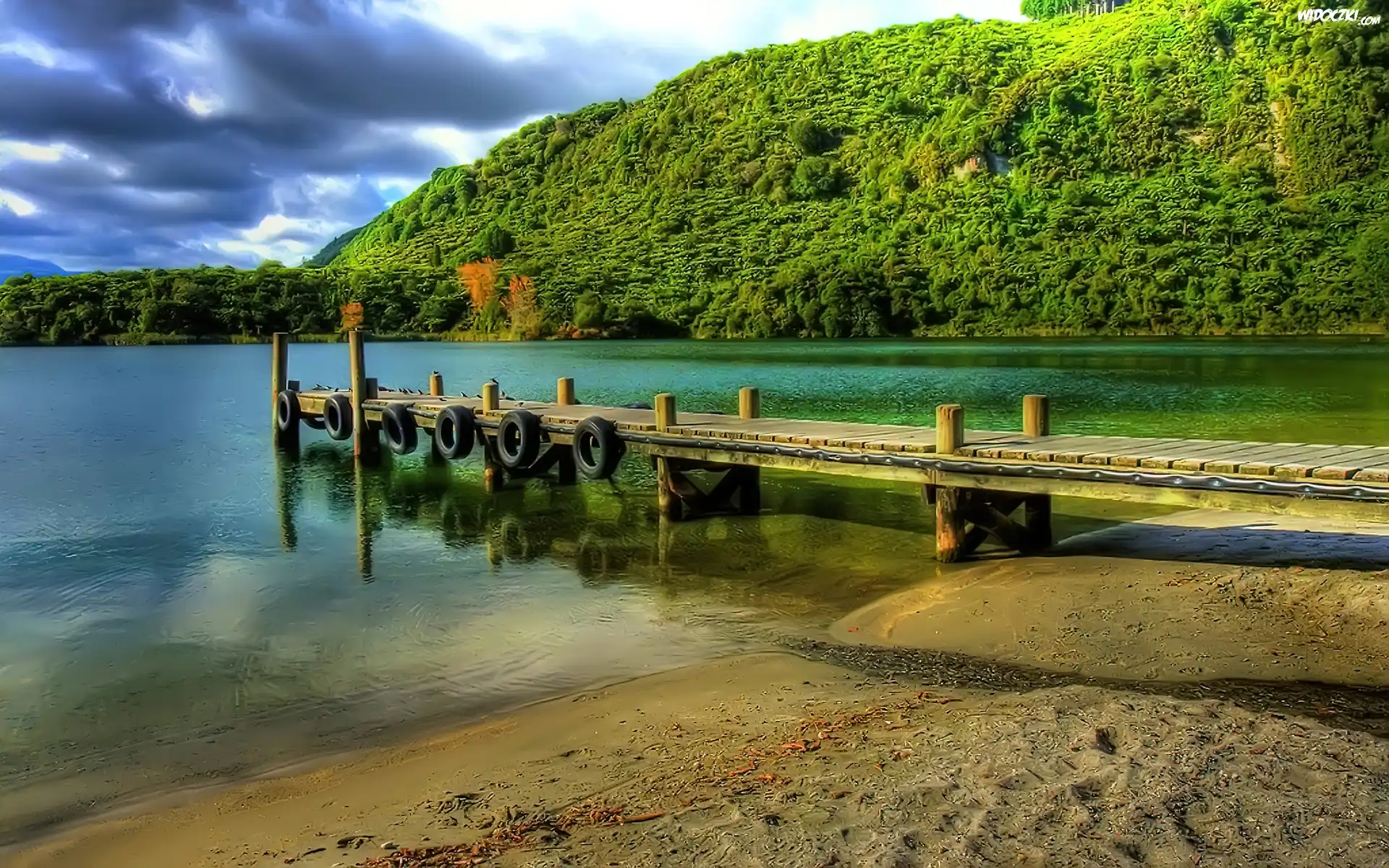 Zdjęcia, Jezioro, Pomost, Wzgórza, Piasek