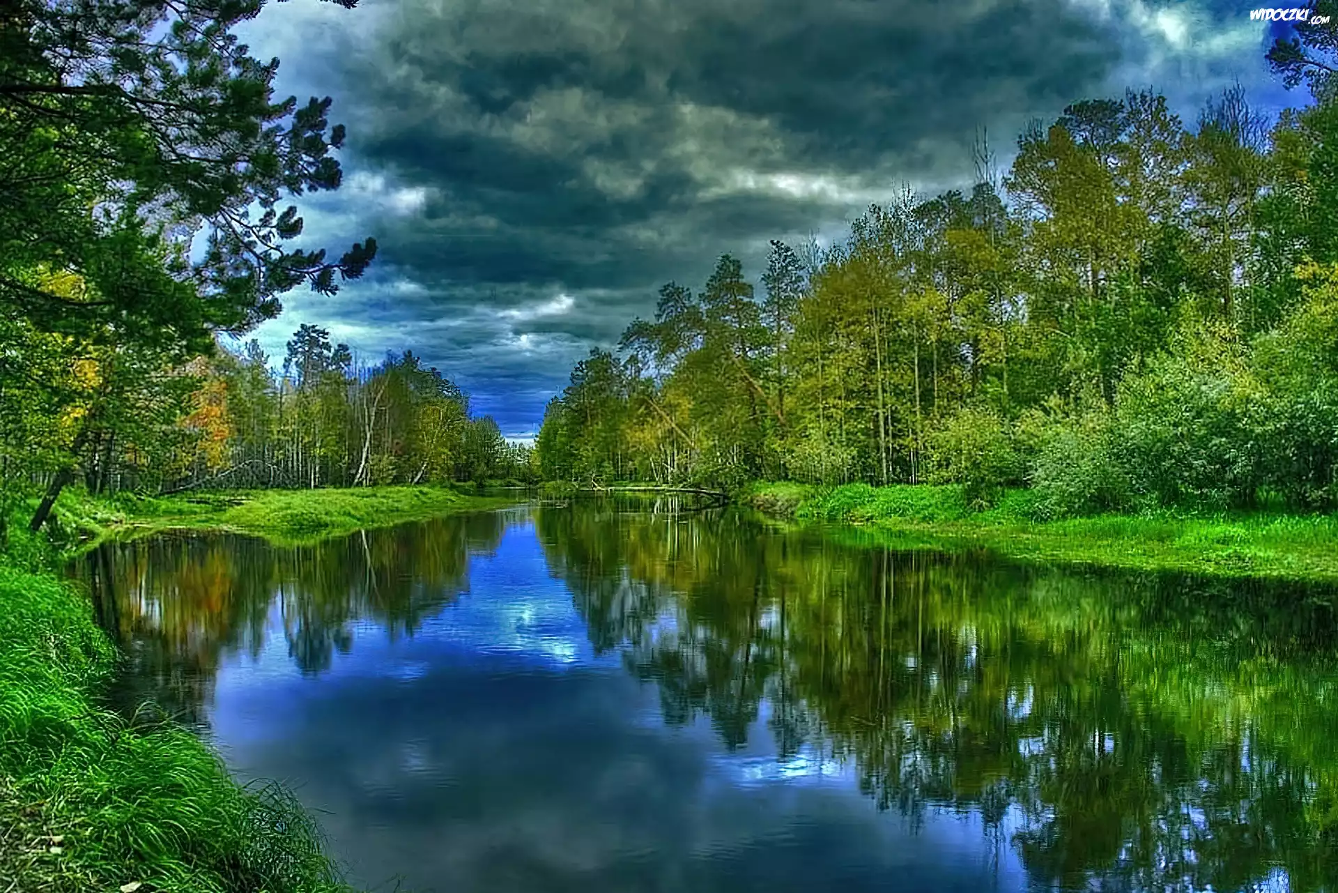 Jezioro, Drzewa, Zachmurzone, Niebo
