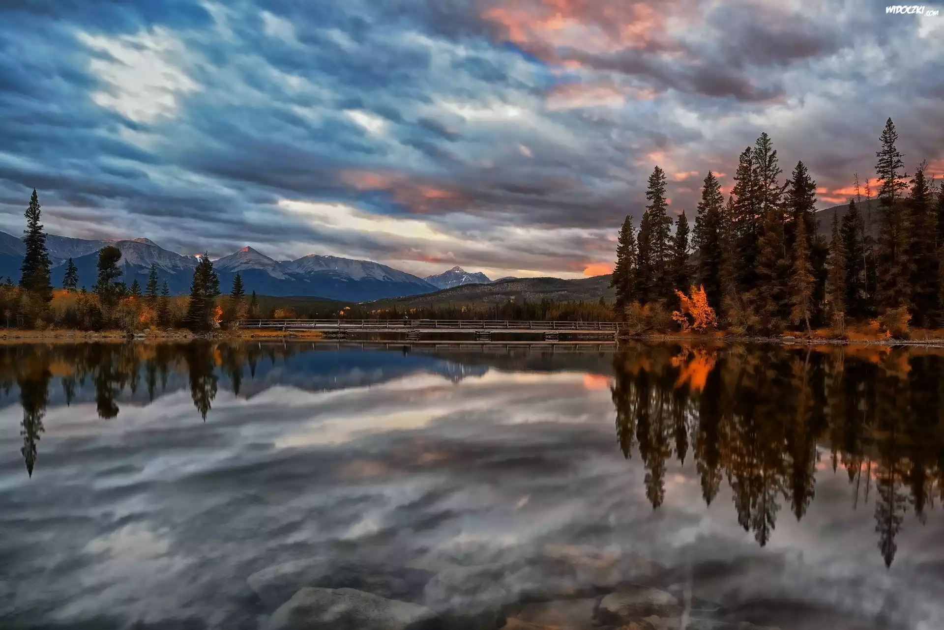 Jezioro, Drzewa, Góry, Zachmurzone, Niebo