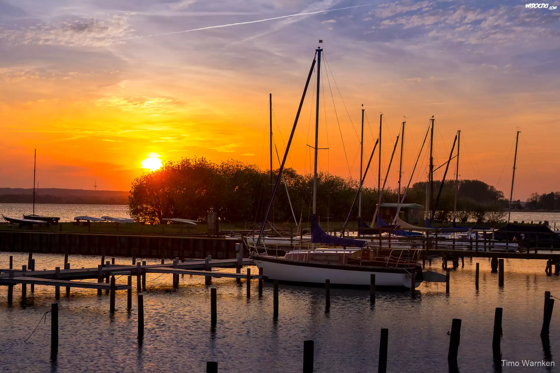 Zdjęcia, Jezioro, Przystań, Żaglówki, Pomost, Zachód słońca