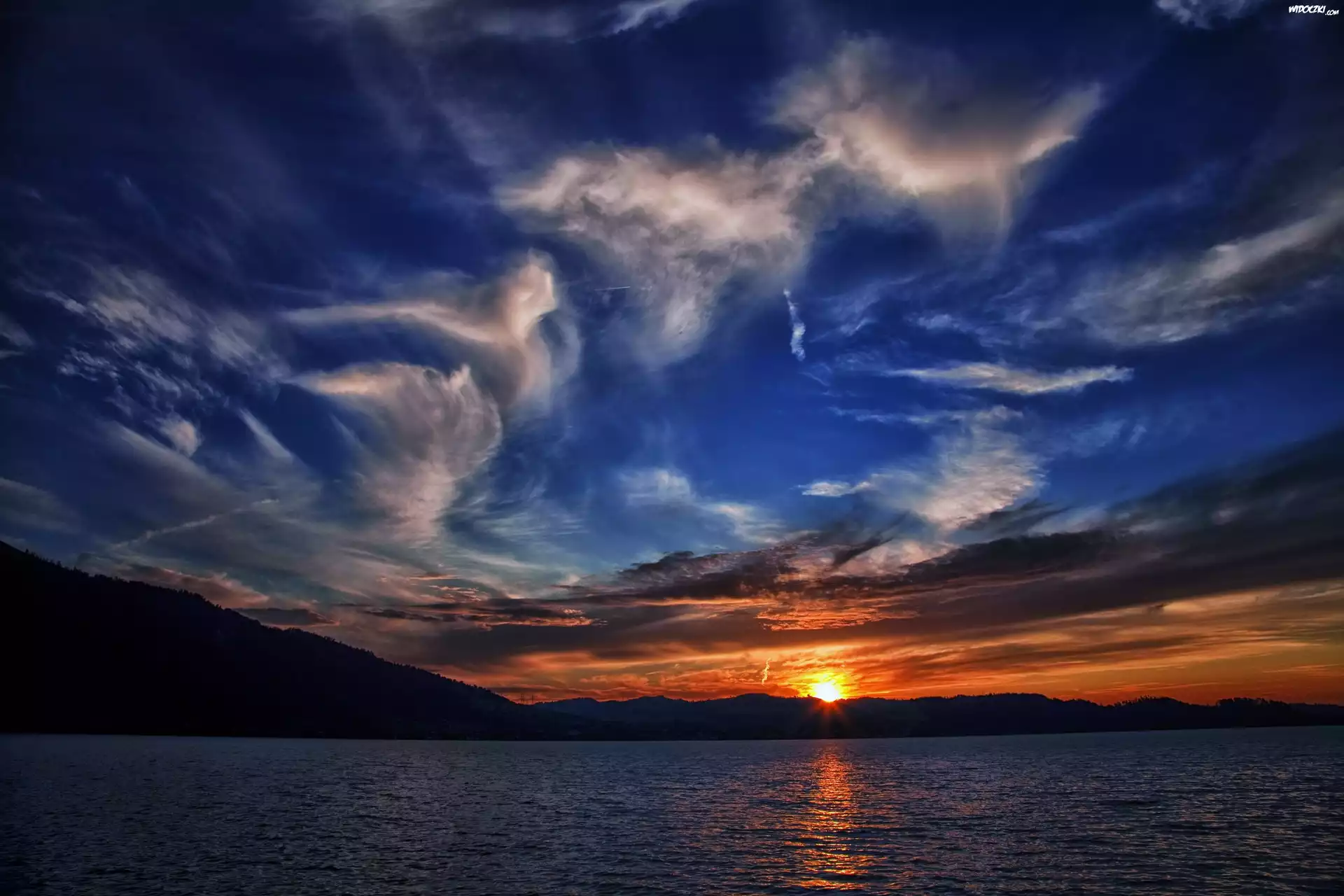 Jezioro, Niebo, Chmury, Zachód, Słońca