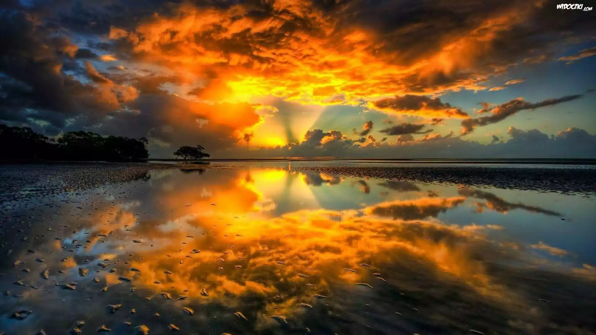 Jezioro, Odbicie, Chmury, Zachód Słońca