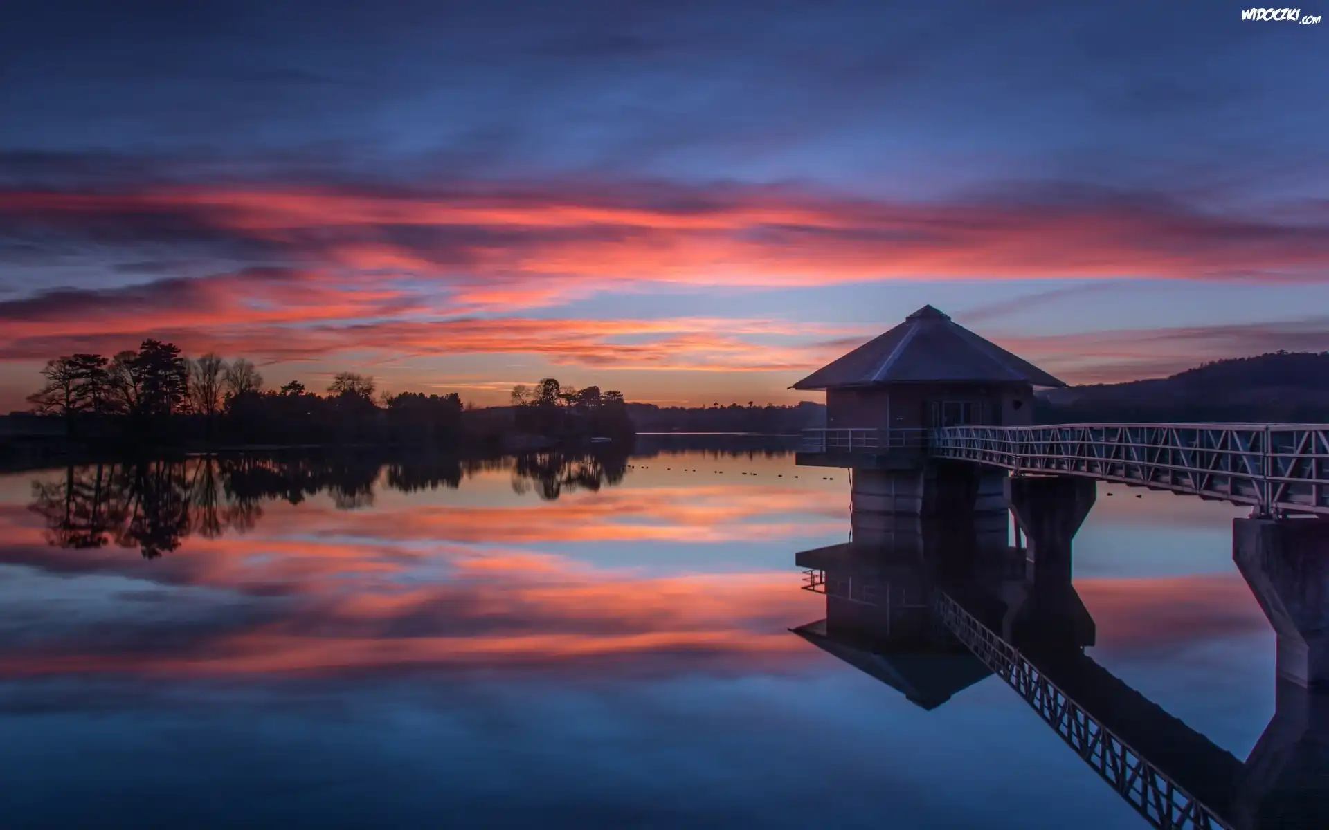 Jezioro, Pomost, Domek, Lasy, Zachód, Słońca
