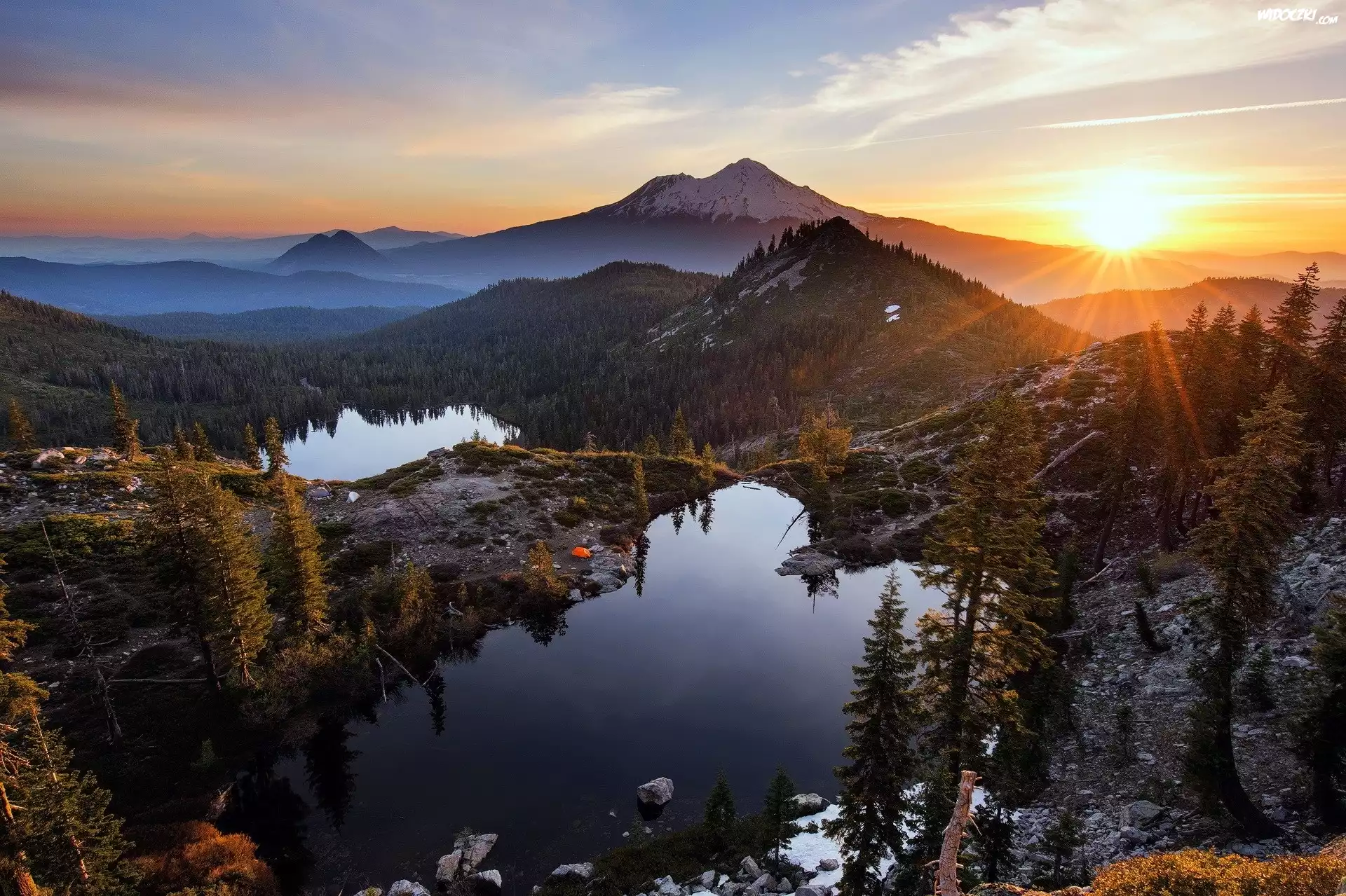 Zdjęcia, Jezioro, Góry, Drzewa, Zachód, Słońca