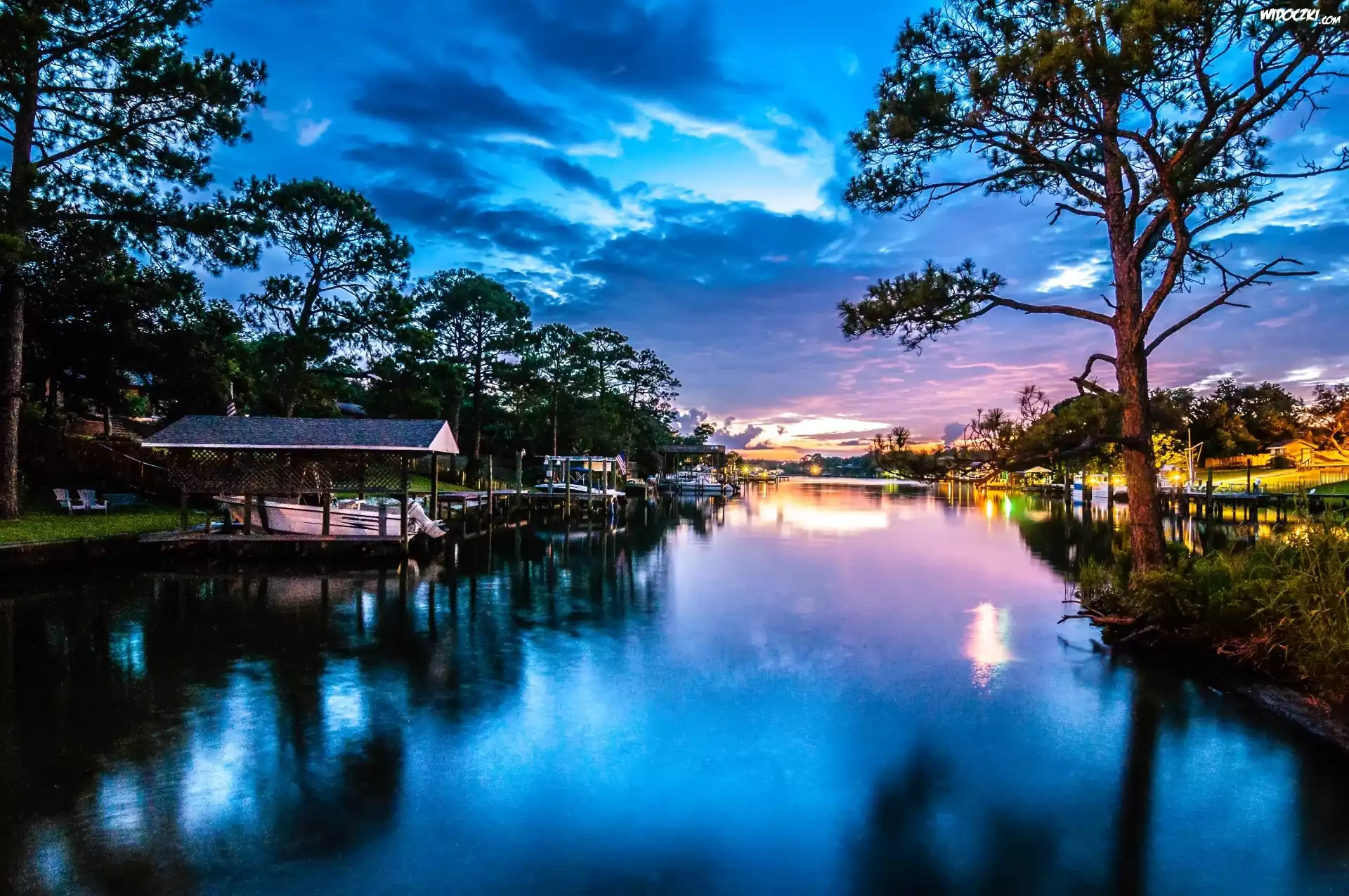 Zdjęcia, Jezioro, Niebo, Drzewa, Odbicie, Zachód, Słońca