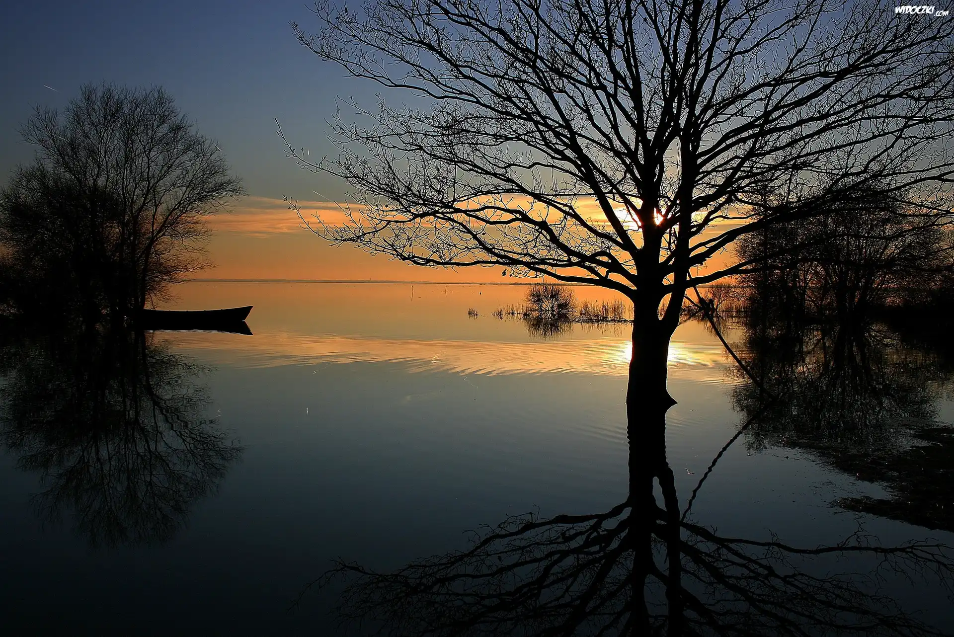 Jezioro, Łódka, Drzewa, Odbicie, Zachód, Słońca