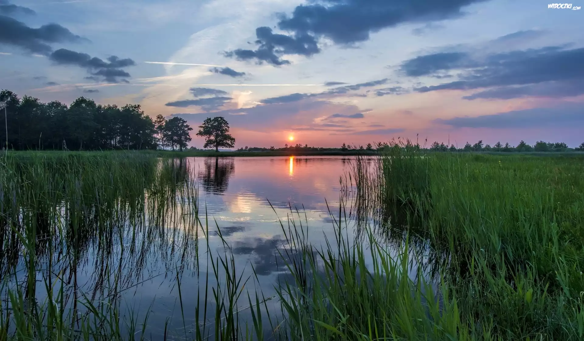 Jezioro, Trawa, Drzewa, Zachód słońca