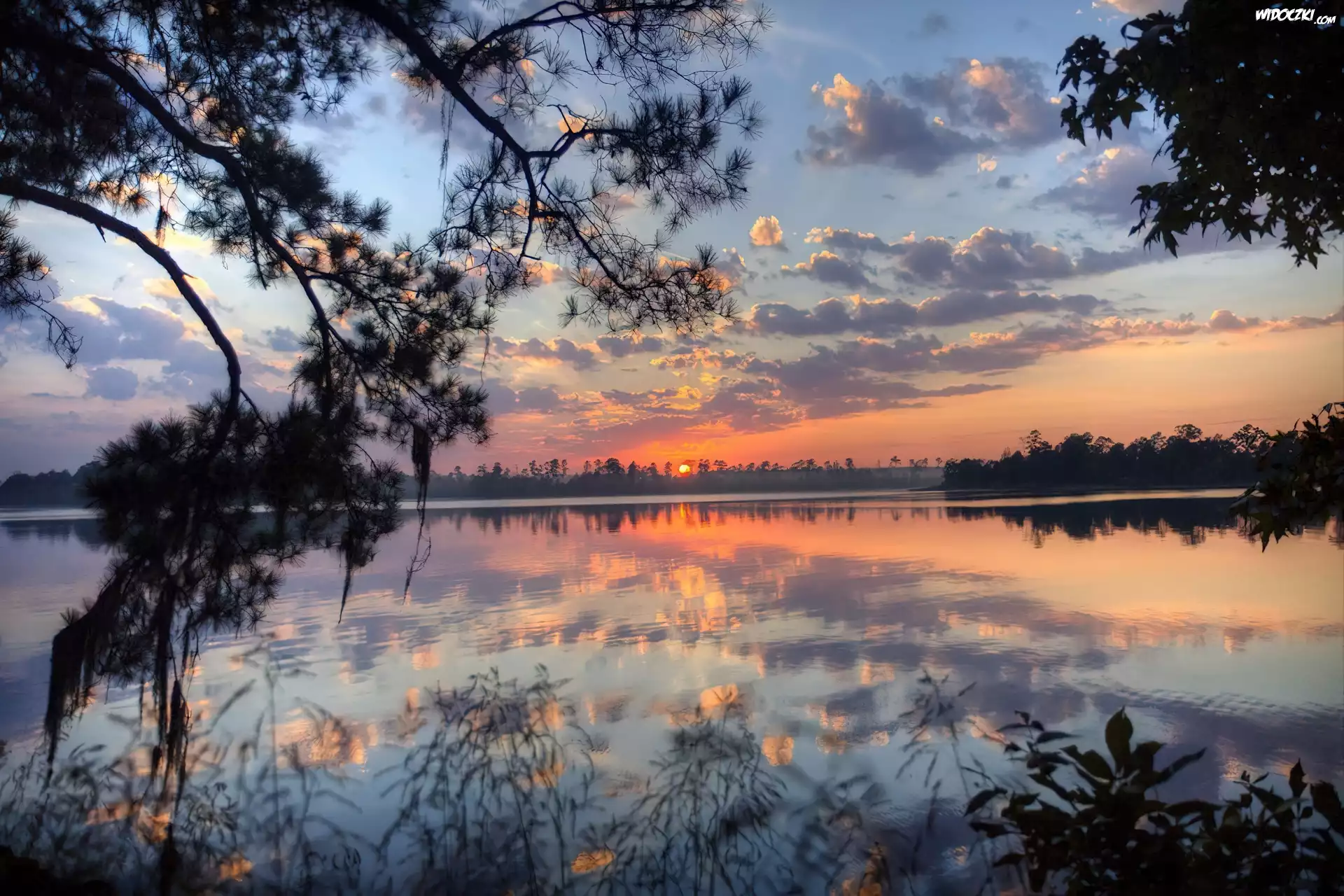 Zdjęcia, Jezioro, Gałęzie, Zachód Słońca
