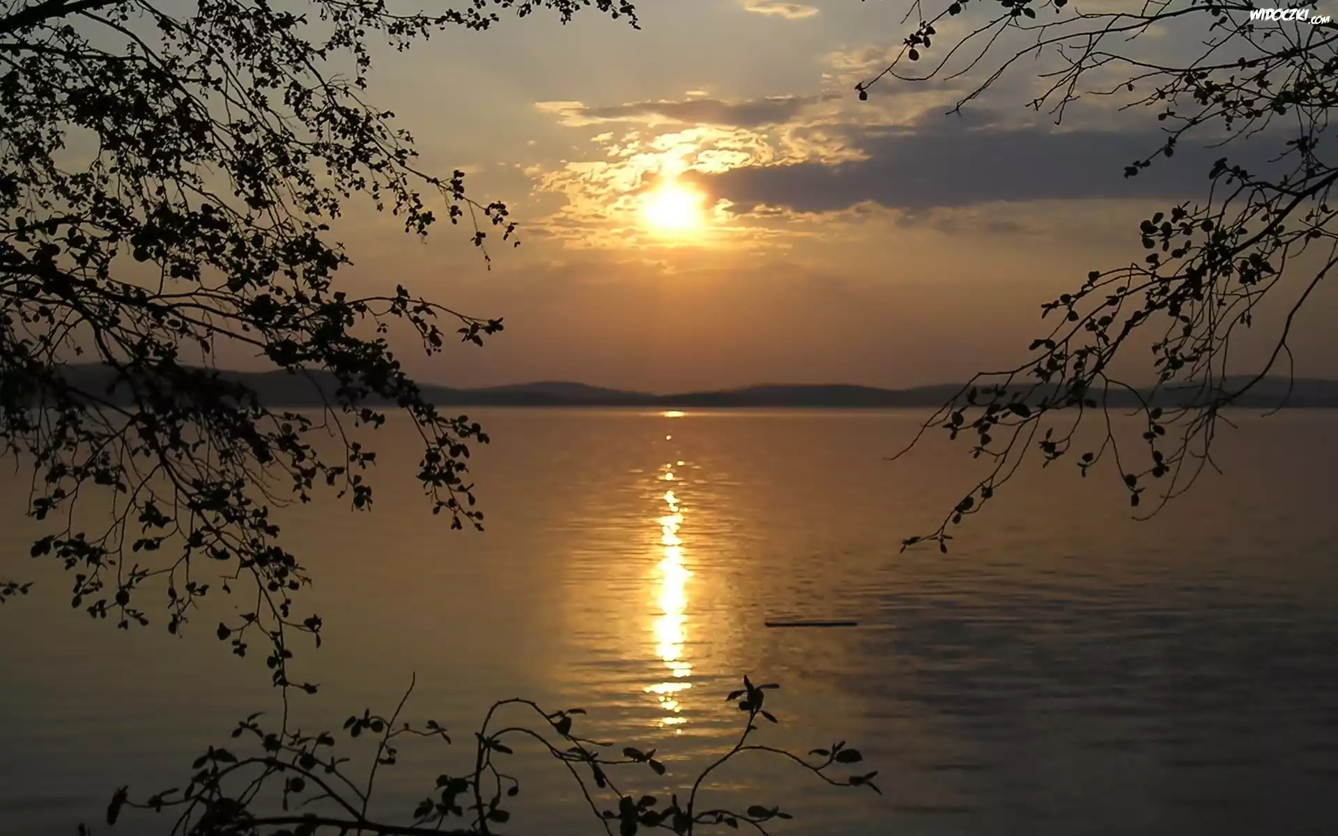 Jezioro, Drzewa, Góry, Zachód, Słońca