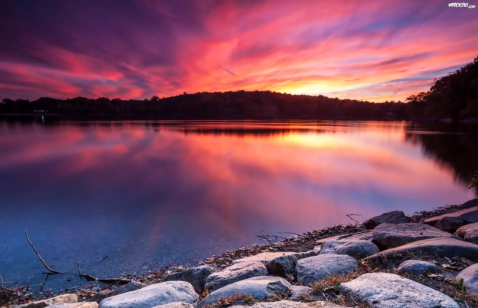 Zdjęcia, Jezioro, Brzeg, Kamienie, Zachód, Słońca